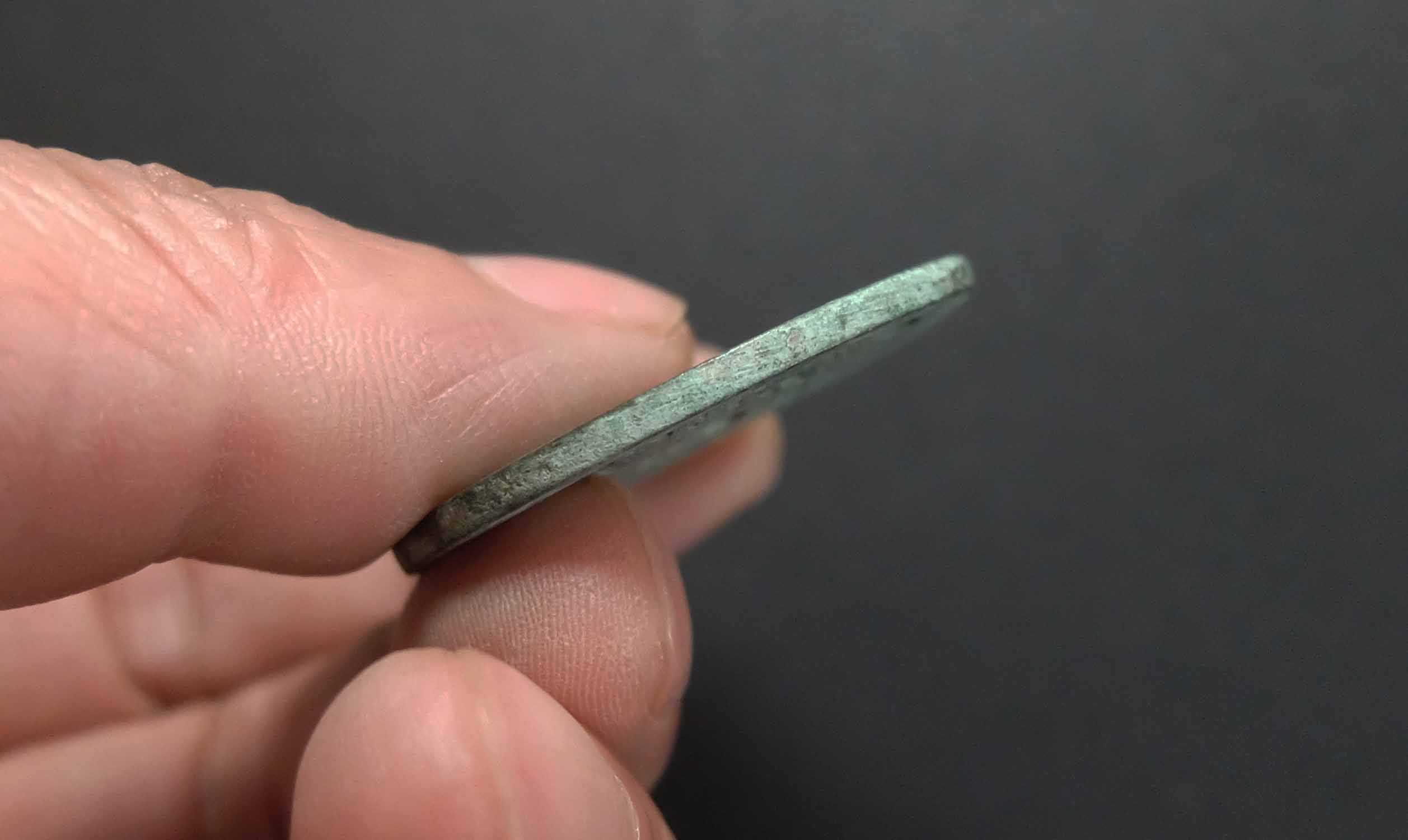 次观铸相。不难看出,本品铸相规整有加,其直径约为36.21毫米,重约12.71克,铸体厚薄适中,折五形制确定。续可观其铸相,方正圆矩,平整地章,穿轮干干净净。续观其字廓,轮廓清晰,深竣挺拔,笔划清晰相对较为纤细,鼓凸则是自然有度,毫无做作之态。如此,观铸识体,本品就铸相而言,具官炉品质,其门再开。