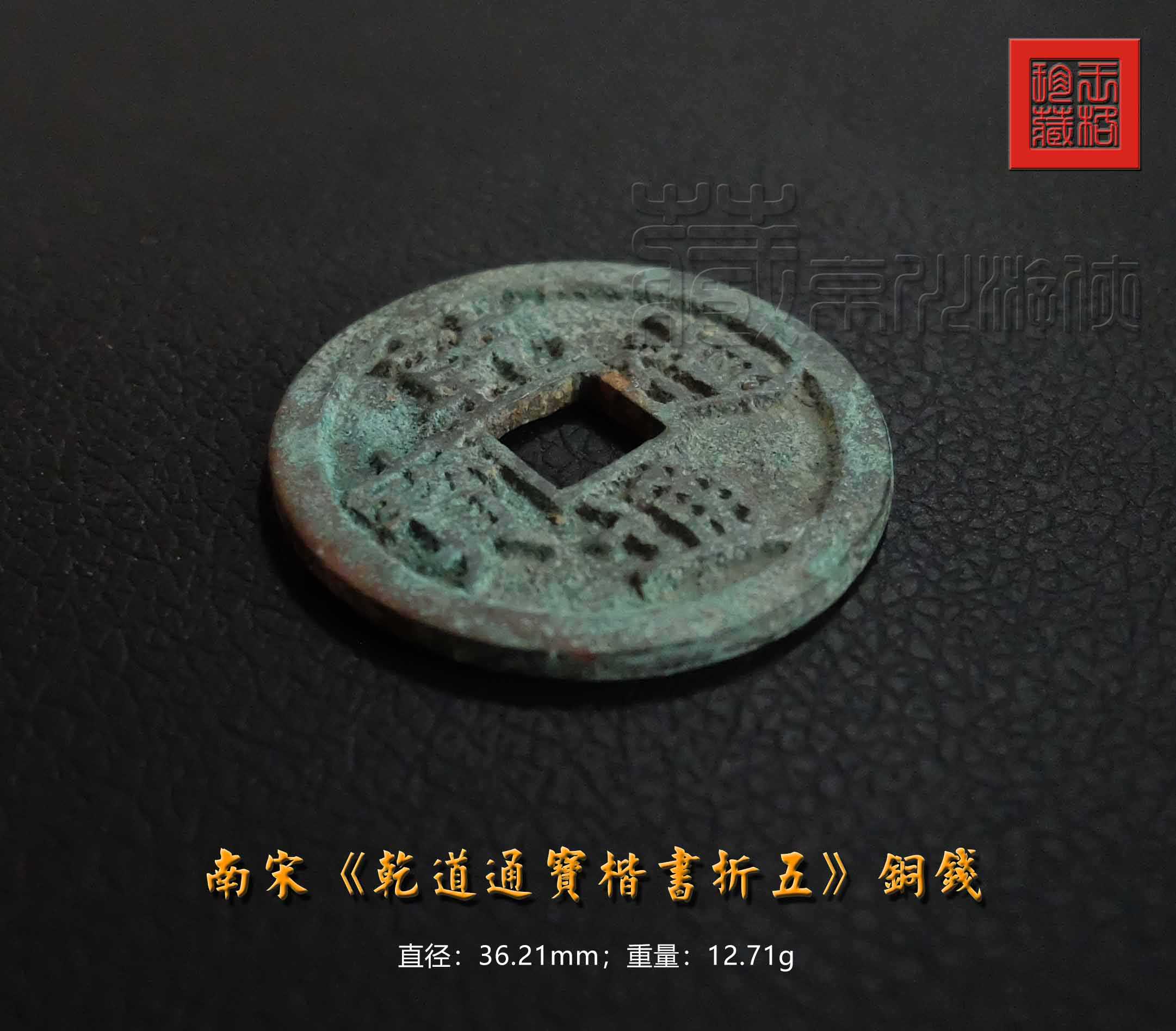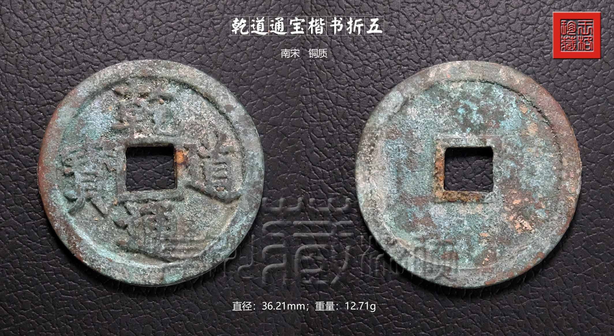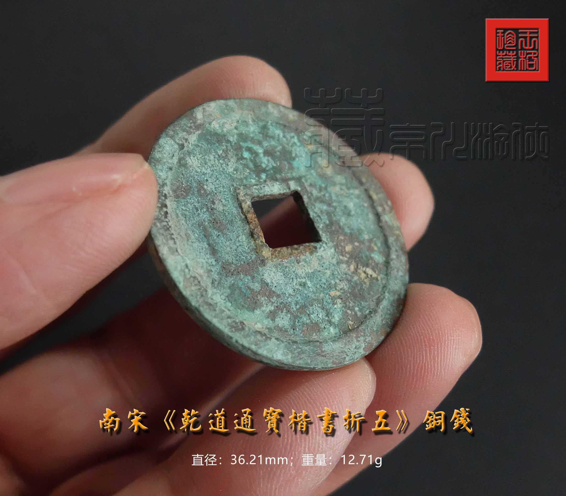 乾道通宝,乃南宋孝宗乾道年间(公元1165—1173年)之铸币。其直径约34毫米上下,定形制为折五。其中,可见华光谱编著之《中国古钱大集》中批曰:“世仅二枚”,且“版别有异”。这里,版别有异,就通常情况而言,可能性是完全存在的。然,其批曰“世仅二枚”,则并无任何依据和道理,不过是早前所见甚罕或者著谱者个人眼界所及的一管之见,不足以奉为金科玉律矣。
