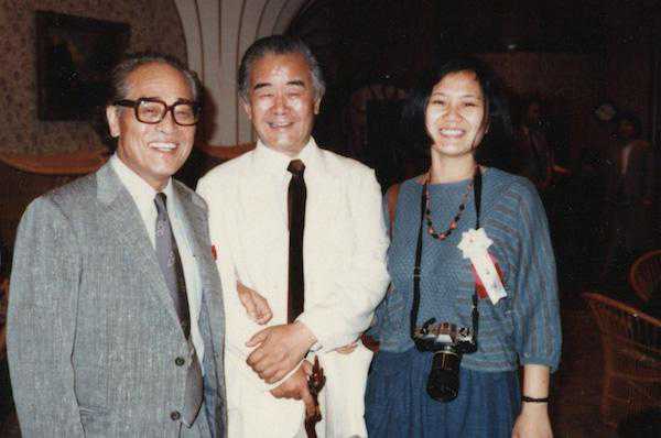1984年梁缨在日本“黄胄展览”开幕式上接待黄胄友人。