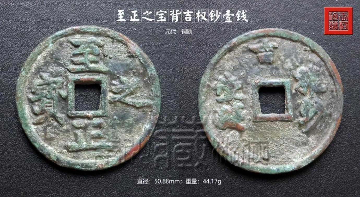 至正之宝,乃元顺帝至正年间(公元1341—1368年)所铸。此钱纪重,形制出号,其用以代表交钞与纸币并行。该钱青铜质地,背纪值越大钱径越大越厚重,其钱文楷书,面文书相端美俊朗,制作亦见精良,乃为元代晚期铜钱美书美制品之一。