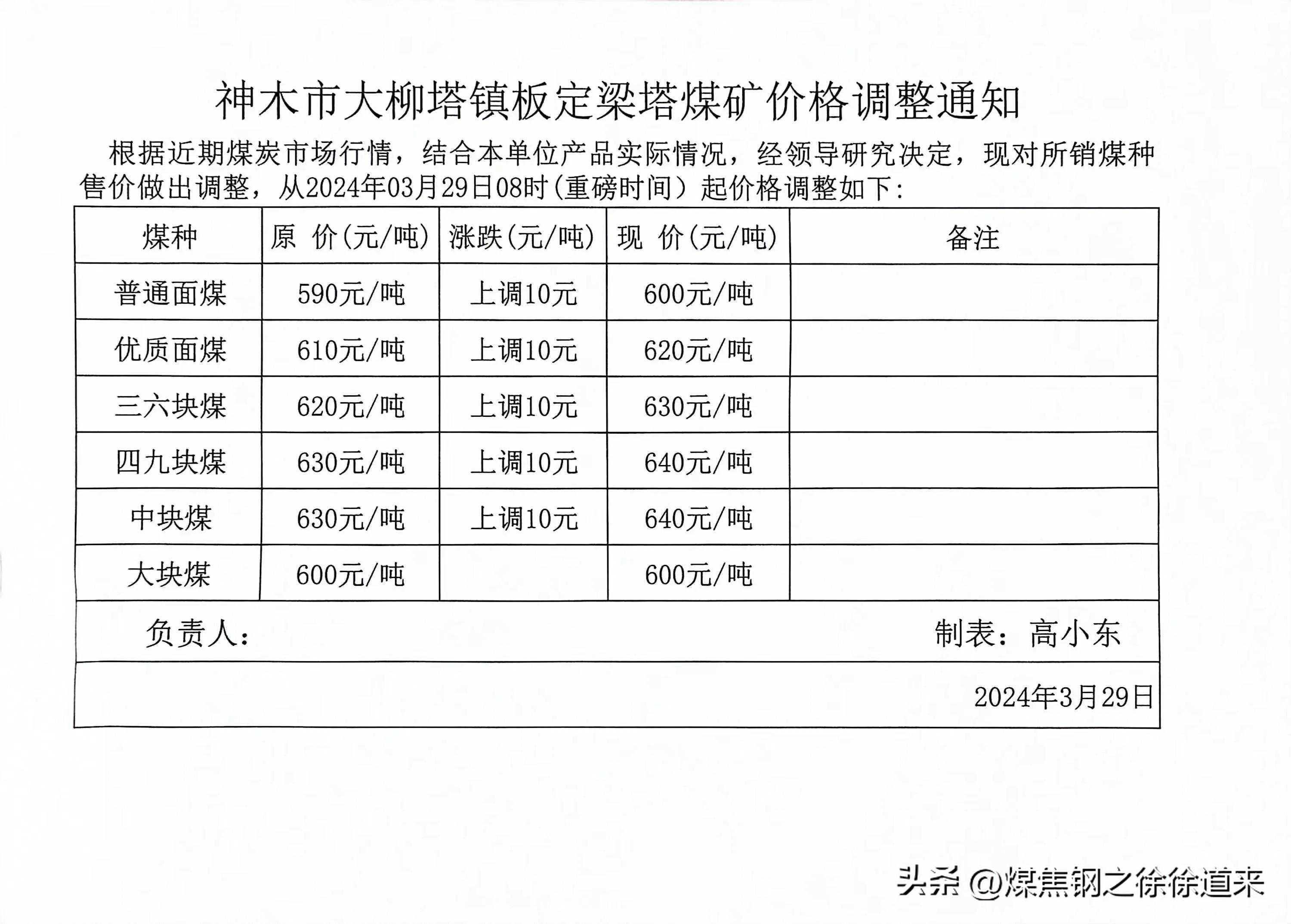 神木大砭窑煤矿从3月29日煤价调整以装车系统的数据为准,一三籽,一二籽各涨价20元,正常销售,谢谢合作。