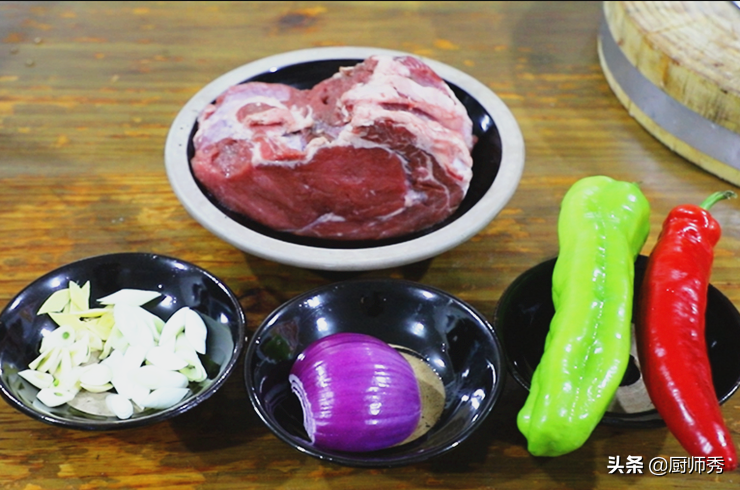 牛里脊一大块、葱姜蒜、洋葱、青红辣椒