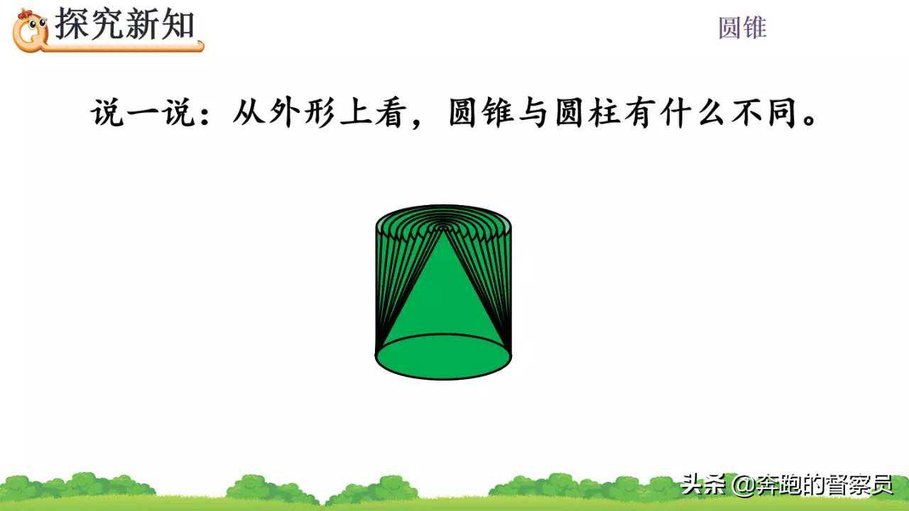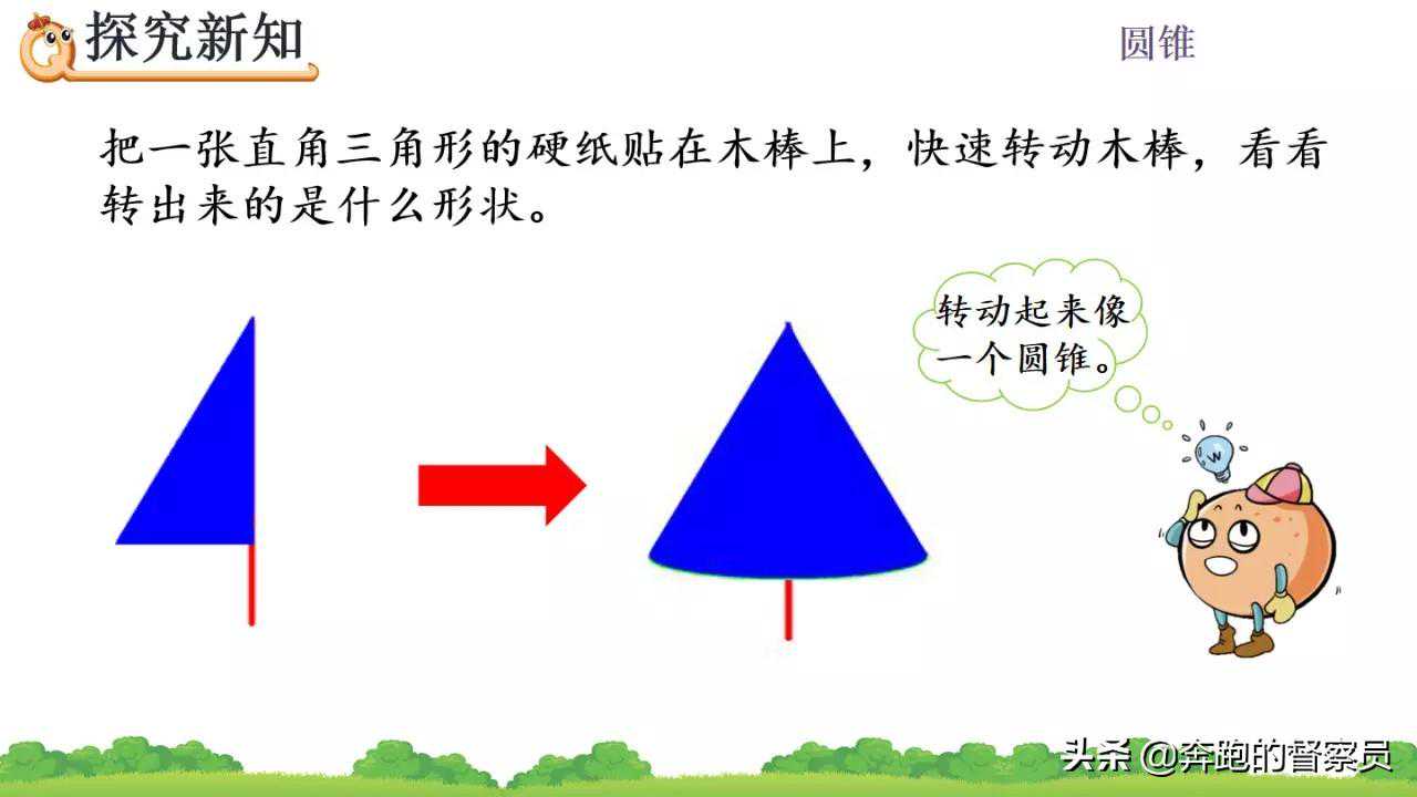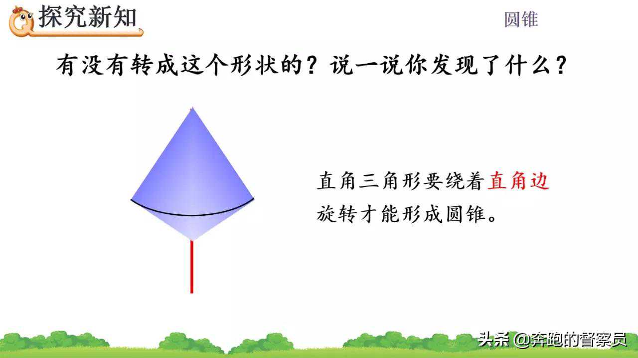 圆锥的认识我们主要是通过圆锥的组成形式以及由平面图形变成圆锥的立体图形的过程当中,其形成的形式跟圆柱的行程相类似,圆锥是通过颜直角三角形的一条直角边作为轴通过旋转一周而形成的立体图形。