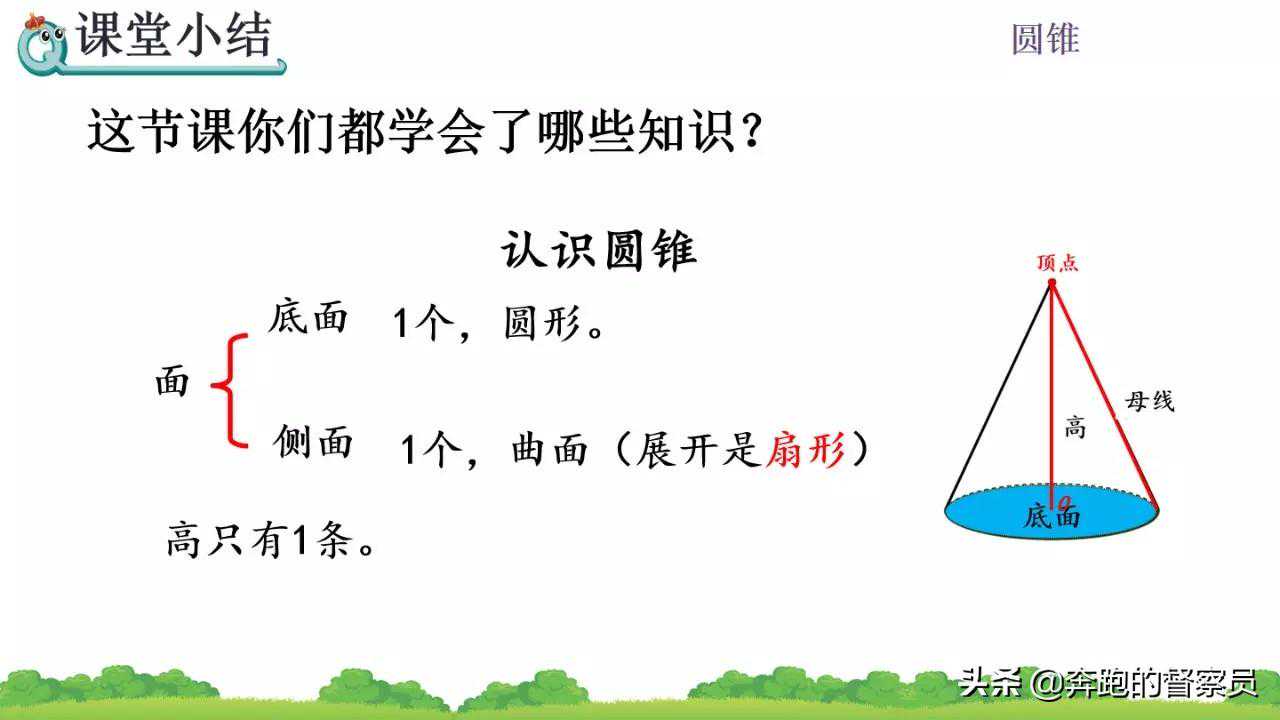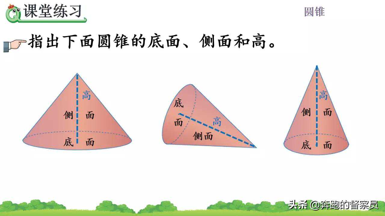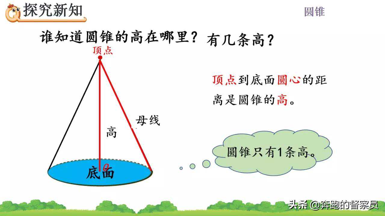 (3)高的特征:圆锥有一条高。(圆锥的顶点到底面圆圆心的距离,称为圆锥的高。)