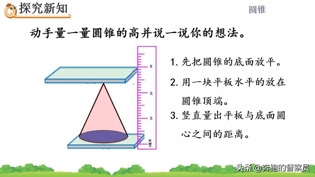 写在最后:通过对圆锥的展开图以及圆锥组成部分的特点的充分了解,我们需要建立圆锥与圆柱之间的关系,找到他们的共同点与不同点联系在一起的学习,让我们对圆锥的认识将更进一步,也将为后续的体积,表面积的计算或体积的相互转化打下坚实的基础。这部分内容其重点在于圆锥高度的测量方式和以往的方法略有不同,需要通过转化的方法才能进行实地的测量。