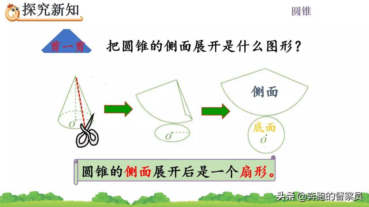 第三,对圆锥的认识,我们也是通过展开图来了解的圆锥的,底面是一个圆,其侧面展开为一个扇形。我们可以通过与圆柱相比较,找到他们的共同点与不同点,这样对于圆柱圆锥的共同认识和他们之间的关系的了解又更近了一步。