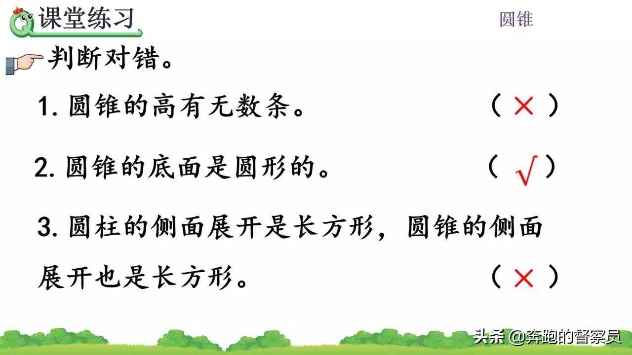 2.圆锥的高度是两个顶点与底面之间的距离,与圆柱不同,圆锥只有一条高