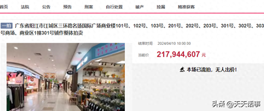此次拍卖的是名扬国际广场商业楼101号、102号、103号、201号、202号、203号、301号、302号、303号、401号商场、商业区1幢301号铺,整体进行了拍卖,建筑面积达到了54,891.68平方米,是阳江市一个非常大型的商业广场了。商场所有人为阳江市鹏超房地产开发有限公司,爱企查显示,阳江市鹏超房地产开发有限公司成立于2007年,注册资本2000万元,不过公司已经被列为失信人了。
