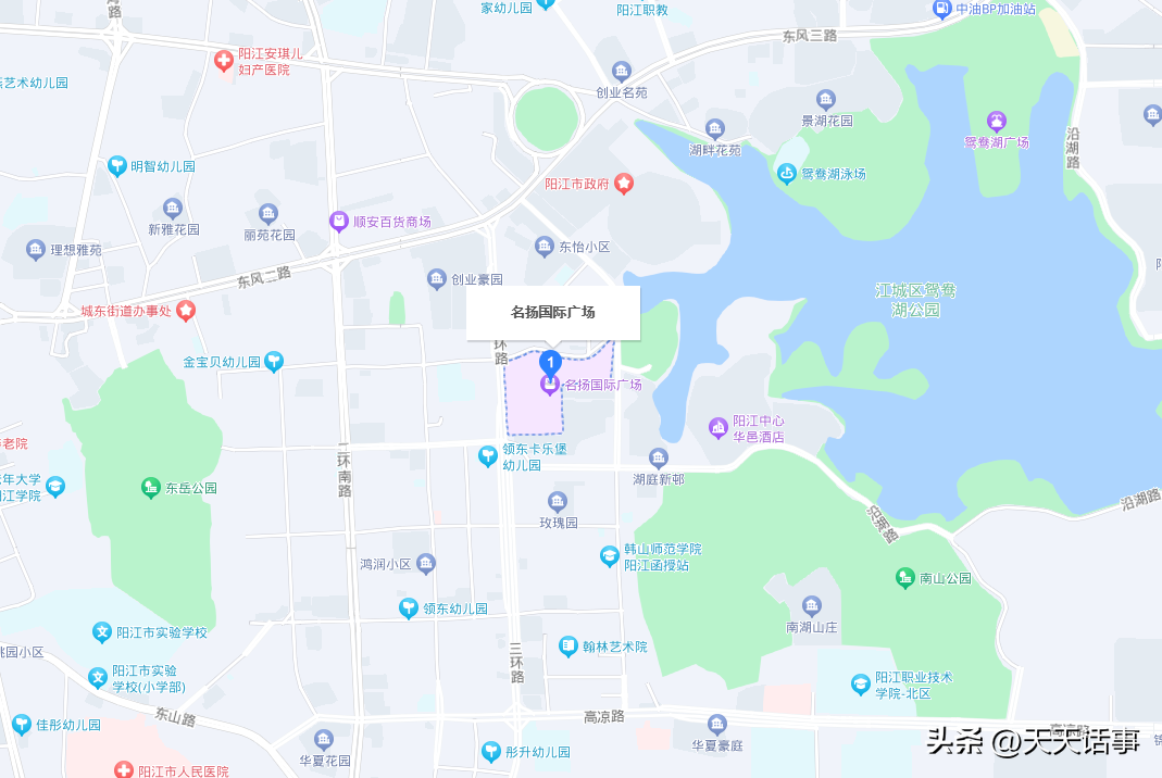名扬国际广场是阳江市最早建设的一个大型商业综合体之一,建成于2010年,在当初建设的时候,欲要打造成阳江的“天河城”,其地段在阳江市区绝对是黄金地段,位于阳江市江城区三环路工业一街2号,其东边毗邻鸳鸯湖公园,这里现在是阳江的市中心,商场距离阳江市政府也是非常近,周边居住小区众多,人流量巨大,现在也是阳江市最热闹的一个商业综合体之一,目前名扬国际广场有大润发等入驻,平时阳江人都喜欢到此逛街购物。