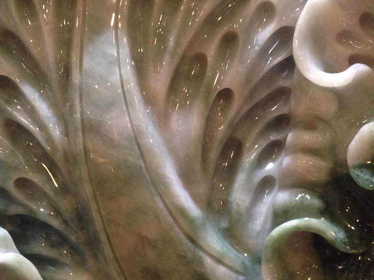 此外,裂隙有大小有开合等种类,这对估价加工利用有很大影响,是翡翠一大缺陷。业内人士说,不怕大裂怕小绺,宁赌色不赌绺。在赌石交易中对大绺外绺注意观察如夹皮绺、大绺、恶绺等,对小绺、内绺观察相对薄弱,必须慎之又慎。专家经过研究指出,应用绺的颜色可以判断其破坏程度,呈白色是一般破裂,如果呈红、黄、黑色则为严重程度。这些是开口裂的特征,无明显颜色者属于微开或合口裂。成品和明货(开门翡翠)则应仔细观察内裂小裂如蹦瓷裂、马尾裂等,尤其是随绿裂、错位裂对其定价销售有着直接影响。