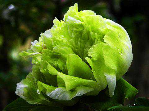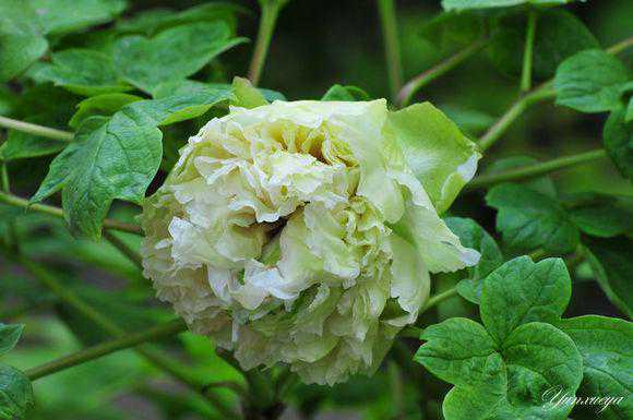 豆绿,牡丹四大名品之一,皇冠型或绣球型。有一牡丹品种称为“萼绿华”,据说是绿牡丹的鼻祖,唐代栽植在永宁的王宫里。大瓣楼子花,每片花瓣上都有绿色,乍一看,整个花朵像许多蝴蝶聚在一起,所以,又称“绿蝴蝶”。