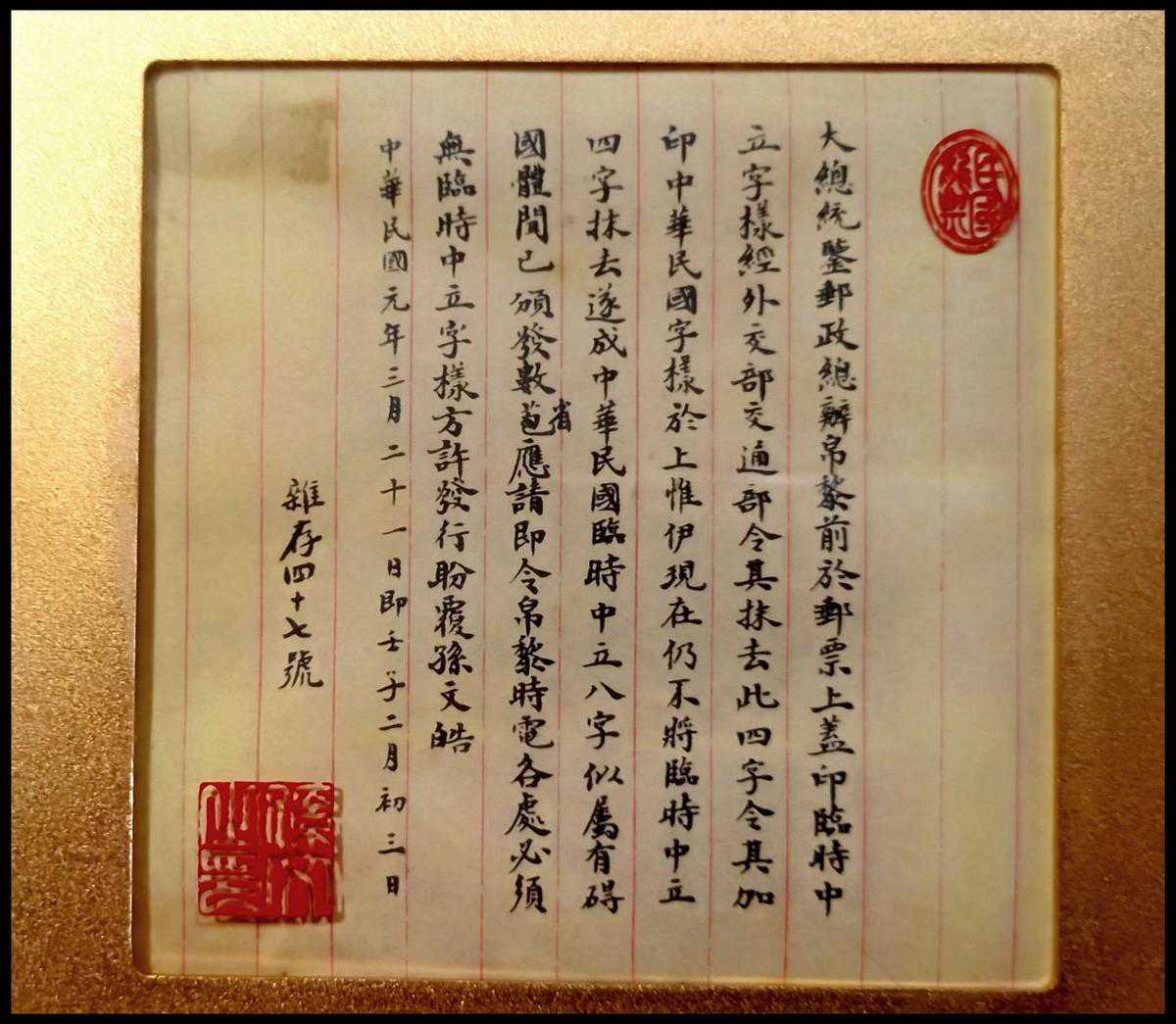 为此孙中山特致函袁世凯,要求废除“临时中立”和“中华民国临时中立”的加盖邮票。这些邮票发行时间短、发行范围窄、发行量小、发行套数不全,产生了“民国珍邮-临时中立”。不叙。至今文献记载大全套“临时中立”邮票只有五套(其中有一套作为国礼送给了美国总统罗斯福,换来美国政府的外援,极大地支持了中国抗日战争)。