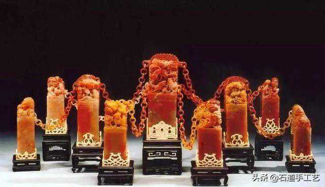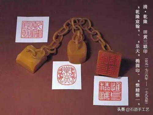 寿山石的链雕源于清初。现收藏在北京故宫博物院的乾隆御宝《田黄三链章》就是例证。乾隆《田黄三链章》由整块田黄石雕成,三条活动的石链连接三颗印章。石链一环扣着一环,每一环皆活动自如,巧夺天工。
