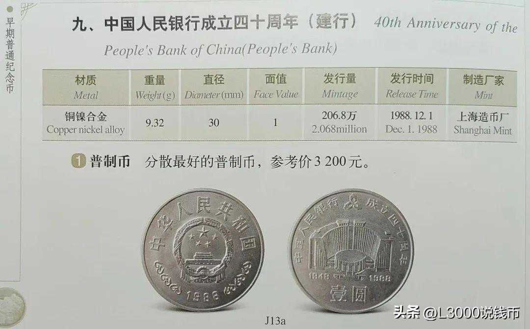 据《中国现代流通硬币标准目录》记载,建行普制币重9.32克,直径30毫米,面值1元,由上海造币厂生产,于1988年12月1日发行,发行量是206.8万,是除了宁夏纪念币之外,发行量第二少、分散最好的普制币,几十年来一直是普制纪念币的“龙头”品种。