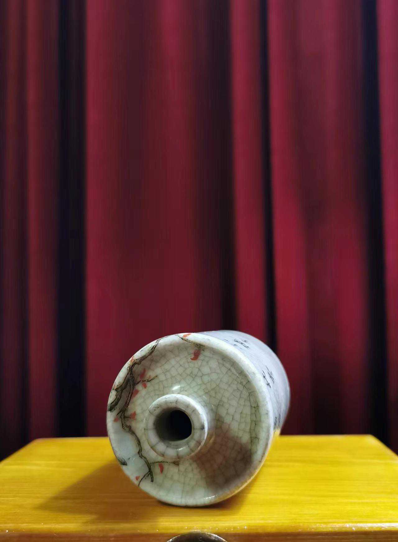这只哥窑釉鼻烟壶上的花枝和鸟尾一直画到鼻烟壶肩上的盘子里,这种瓷器有一个响亮的名字叫“过枝花瓷器”。“过枝”又称“过墙花”。表现“一枝红杏出墙来”的诗意,运用过枝的画法,显得新颖不俗。