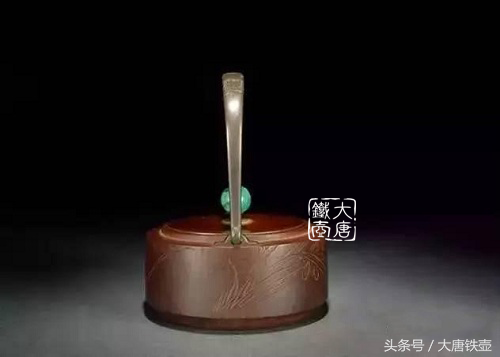 大国寿朗作雕兰图锉金菊梁孔雀石摘钮铁壶(西泠印社2010秋拍952,000元成交)