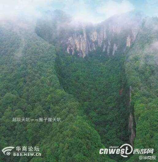 陕西省国土资源厅今天发布:我省汉中发现了分布有49处天坑的罕见世界级天坑群,分布在宁强,南郑,西乡,镇巴。其中,常规天坑31个,大型天坑17个,超级天坑1个(圈子崖天坑口径520米,深度380米),这一发现填补世界溶岩地质研究空白。