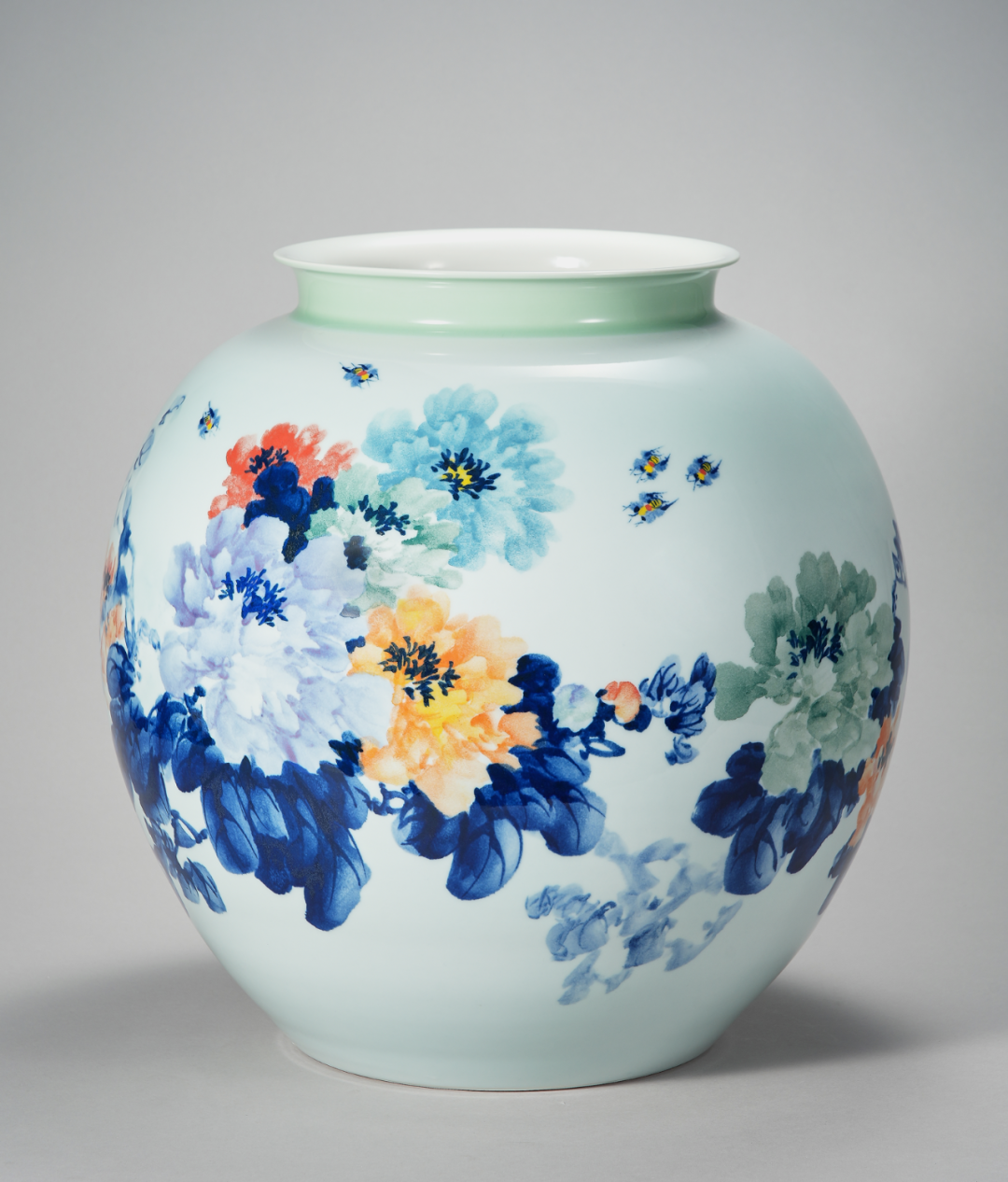 “青花大王”王步第三代传人。本作品胎釉俱佳,造型圆硕,釉面温润如玉,画面构图随器赋形,疏密有致,开合水到渠成。将中国画中的没骨画法和陶瓷材质有机的融入到一起,达到画面光亮平滑,清雅明快、晶莹润泽,具有饱满的水份感,给人静中有动的感觉。是看得见、摸不着,美中藏秀、光影闪动、妙趣横生,充分体现出牡丹花盛开时绽放出的光彩。