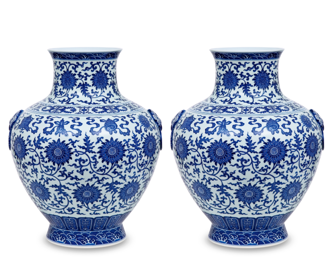 作品设计源自“乾隆青花缠枝莲八吉祥纹大瓶”,原器高52cm、腹瓶颈39cm、现收藏于故宫博物馆。该作品主题纹饰为缠枝莲托八吉祥纹。口沿、足外墙饰海涛纹,腹下部饰莲瓣纹。器形规整,形体硕大,是典型景德镇官窑烧造的作品。乾隆朝器常以八吉祥纹和青莲相配合作为纹饰图案,具有较浓厚的宗教色彩。青花器多绘缠枝莲纹,以青莲谐音“清廉”。八吉祥(亦称八宝贴耳尊)纹自西藏喇嘛教传入,始见于元代,流行于明、清两代,其排列有一定规律。清代八吉祥纹按轮、螺、伞、幢(盖)、花、罐(瓶)、鱼、肠(结)顺序排列。