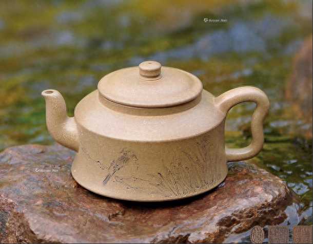 禅钟(王翔刻)高7.8cm;宽15.5cm容量400cc壶身呈扁圆柱状,壶腹处内收;壶肩呈坡状,与壶身过渡自然;三弯流、外方内圆耳廓把;压盖式,扁圆柱状壶钮与壶身呼应。整器端庄稳重、比例协调、结构严谨、制作精良。
