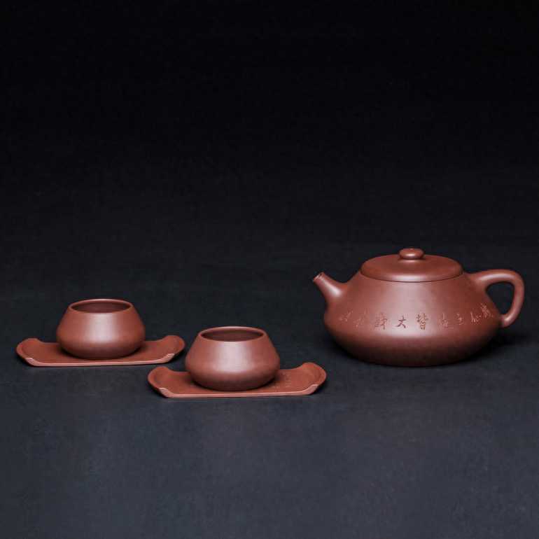 舞组套壶长16cm;高12cm;直径6.5cm此作品为套壶,有一壶两杯、两杯托组成。壶体约呈四方形,但身筒以圆润弧线过渡,不见棱线,壶流线条与壶体成一弧线,直达壶嘴,短流,耳形鋬,壶肩曲线与壶鋬线条过渡自然,毫无割裂之感。壶盖微穹与圆形壶口以嵌盖式密合,壶纽似半月望天亦曲线勾勒出纽体造型。壶肩宽于壶底,但却能给人以稳定之感,是因壶体上流动变化的曲线,赋予该壶以轻盈舞动之美。