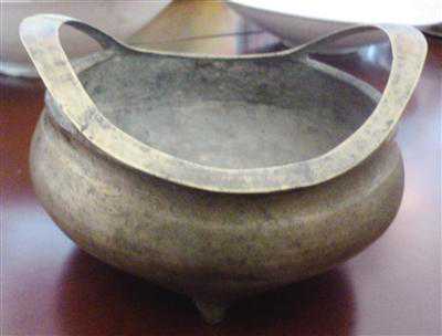 王青廉(呼和浩特市收藏家协会顾问):宣德是明宣宗朱瞻基的年号,宣德六年,他命郑和七次下西洋,进一步沟通中外经济文化的交流。由于政治、经济的繁荣发展,工艺美术品的生产制造也出现了百花争艳的局面,闻名遐迩的宣德炉正是这一时期的产物。宣德炉选料考究,做工精美,款式古朴典雅,当时就十分珍贵。宣德铜炉名冠天下,嗣后多有仿制。有宣德年仿、明中期仿、明末至清早期仿、清末民初仿和新仿等几类。这个香炉不大,三足,有耳香炉的底部刻有字迹,上面写到“大明宣德六年工部尚书吴邦佐监造”。从明代宣德年间到20世纪初期宣德炉历代都有仿制,如今仿品充斥市场,旧货市场或古玩店均可见到“大明宣德年制”款的宣德炉。虽然都是仿品,但投资收藏的价值也有高低之分。从造型和材质来看,这个铜质香炉应该是清中期仿制的明宣德年三足铜香炉。这可以从很多方面推断出来,其中最明显的就是香炉的两耳,早期的香炉两耳喜欢向上立起,越往后就越往下塌。因为不是现代仿品,做工也还不错,也有一定收藏价值。