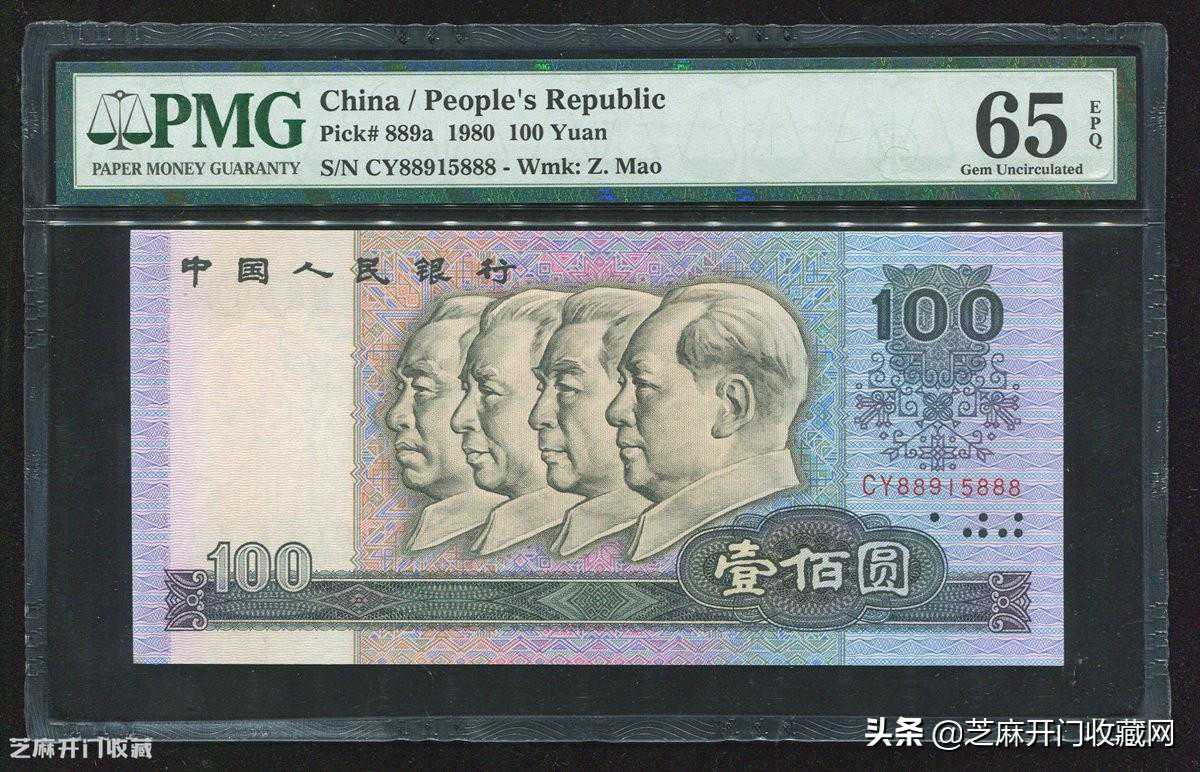 4:1980年第四版人民币壹佰圆一枚,CY冠,尾三同888,PMG65EPQ,估价:RMB10000,成交价格:RMB17250