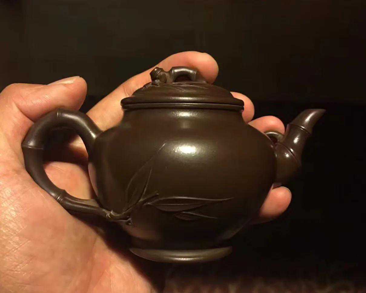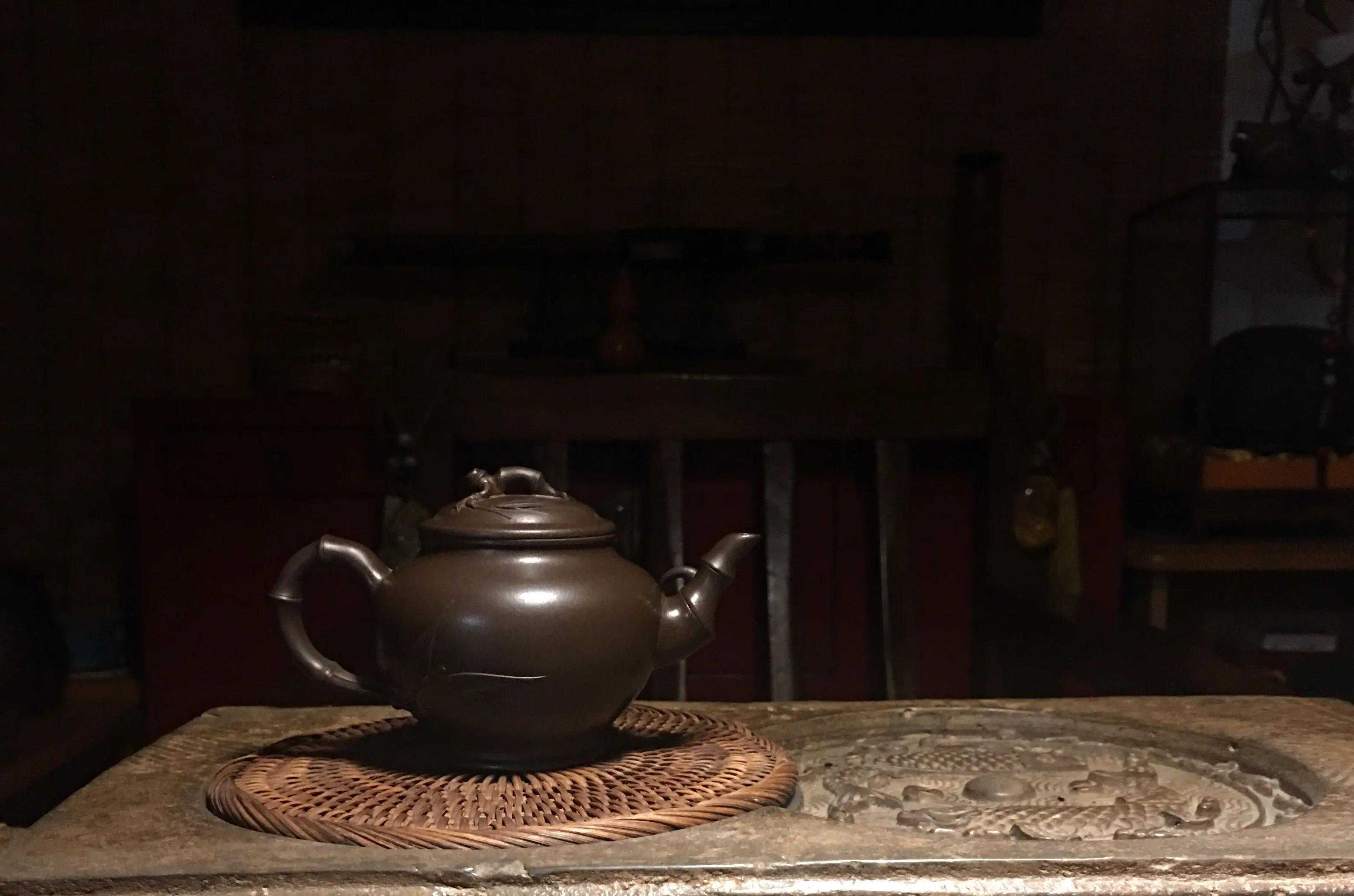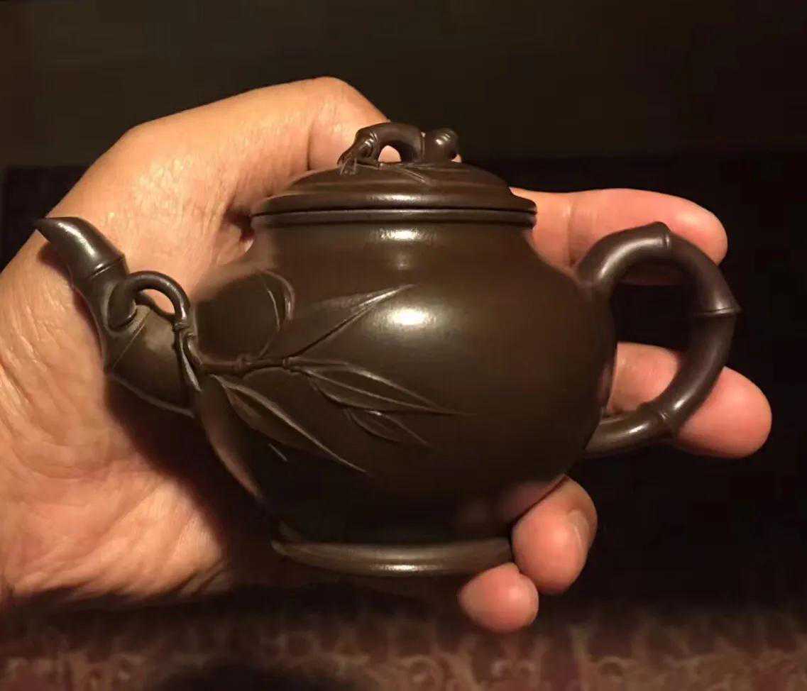 厂壶,是紫砂界对过去宜兴紫砂一厂、二厂所出产茶壶的简称。厂壶的工艺大都偏粗质量良莠不齐,但也不乏良师精品。早年间收得一把小品壶,竹·报春,壶小而精,气势饱满,有神韵。精气神俱佳。底款中国宜兴,盖款芹仙,为紫砂一厂著名老工艺师李芹仙所制(朱可心大师儿媳妇,1955年进厂,拜朱可心为师),所用陈腐老紫泥(比之现在的同类泥料实在是好很多)烧结度极佳,泥色沉稳油润,泡养效果十分漂亮,出水劲爽有力,拿捏舒服趁手。容量小,适合一人独享。十多年来随我一起消灭了好茶无数。