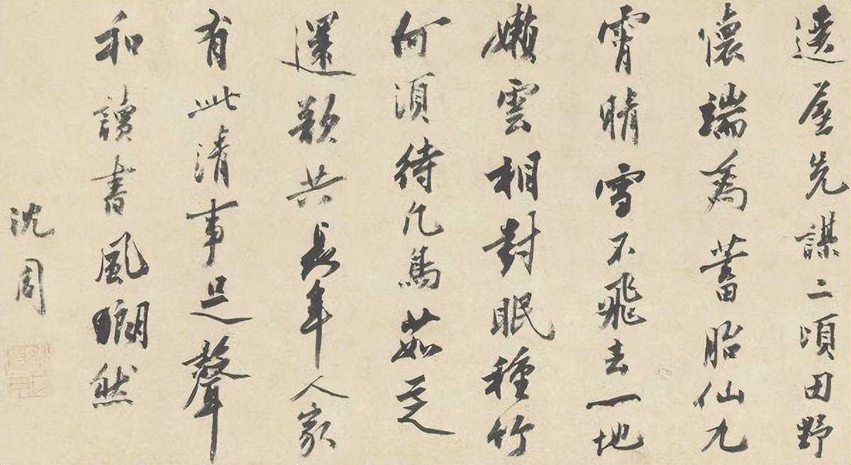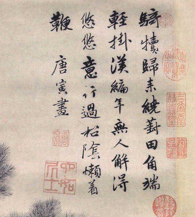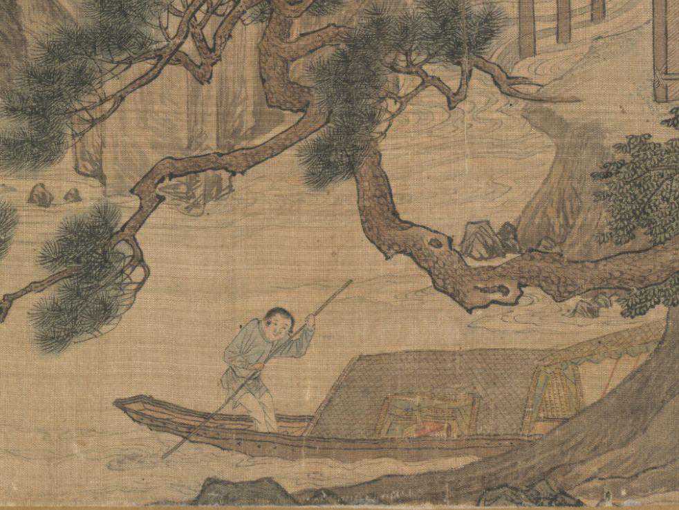 可见周臣是明白人,由于这一致命伤,尽管论笔墨功力,他们之间可以说不分上下,然而,笔墨的灵动性,画面传递的深层内容与气息,唐寅远胜过周臣,相比而言周臣的画就显得板滞多了。