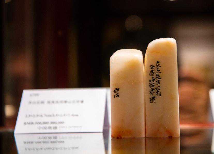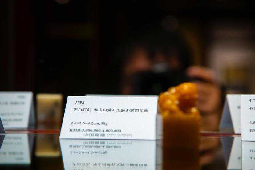 一座玻璃橱窗前,围满了观赏者。橱窗里摆放着49枚印章精品,其中一枚齐白石先生所刻、寿山田黄石太狮少狮钮印,堪称精品中的精品,它大小为2.6×2.6×4.2厘米、重58克,中国嘉德给出的估价为300-400万人民币。