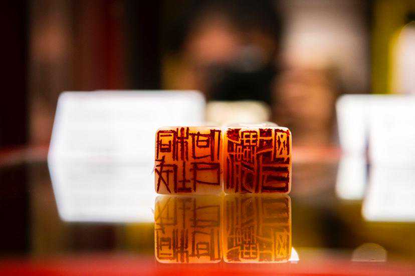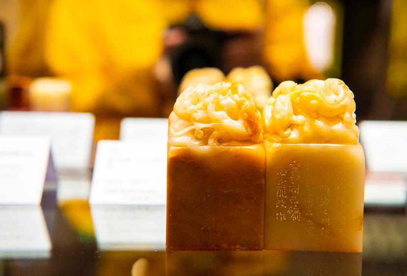 寿山石对章、芙蓉石太狮少狮钮大方章、青田石闲章、青田石四面印自古以以来就有“一印在手、金石同寿"的说法,橱窗展柜中的一枚枚石材精良、工艺精细、篆刻精湛的印章,是自然与人文的完美结合。