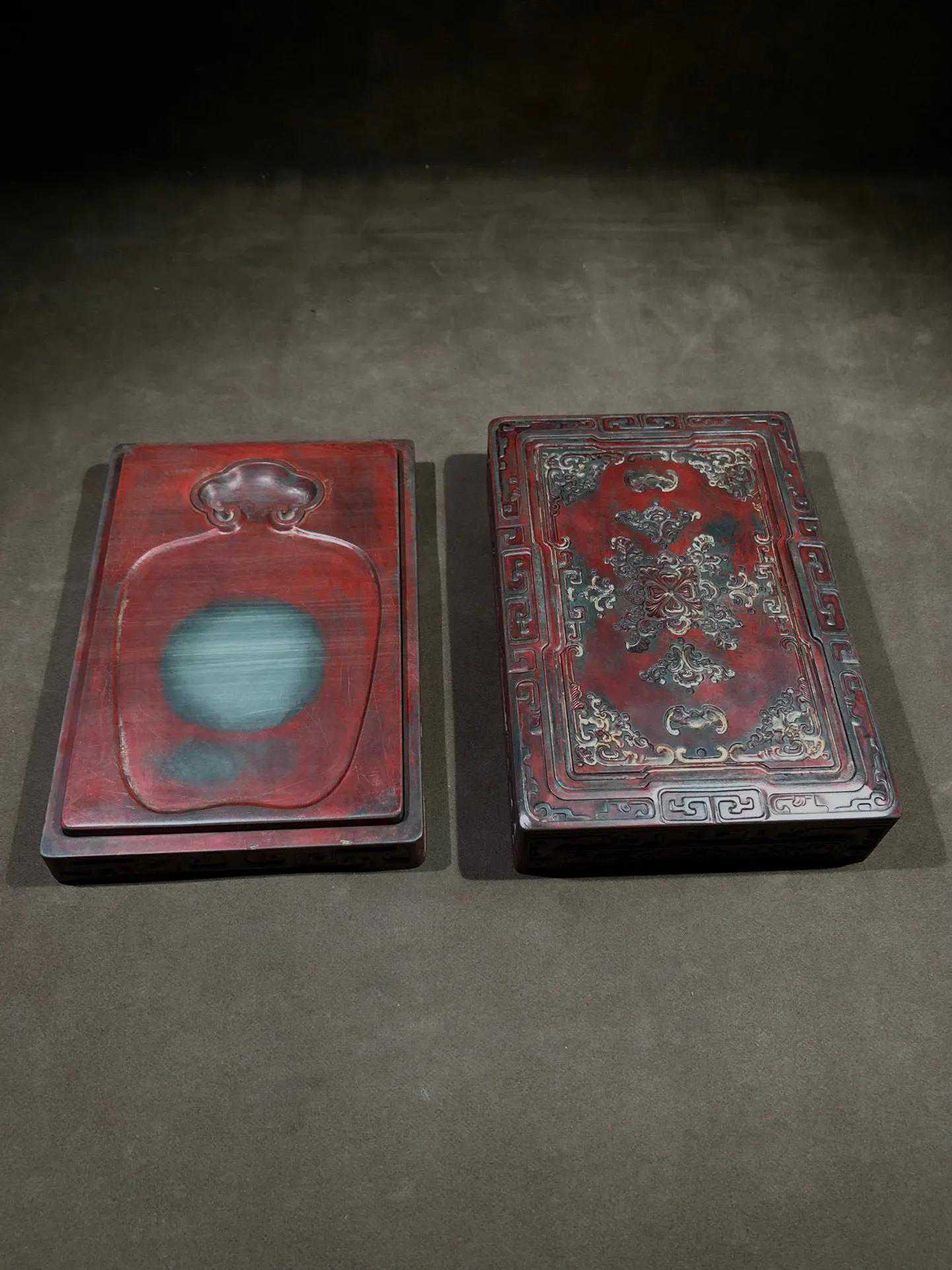 清“乾隆御铭”松花石套砚,因长期研磨朱砂形成朱砂包浆又称朱砚。方形绿色石砚,石质润泽,花瓶形砚面,如意首形池,砚堂有深浅不同之绿色天然横纹,砚背中央凹下之正中位置刻诗文,落款:乾隆御铭。方印:『永宝用之』