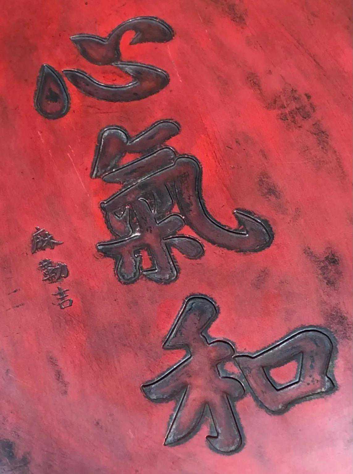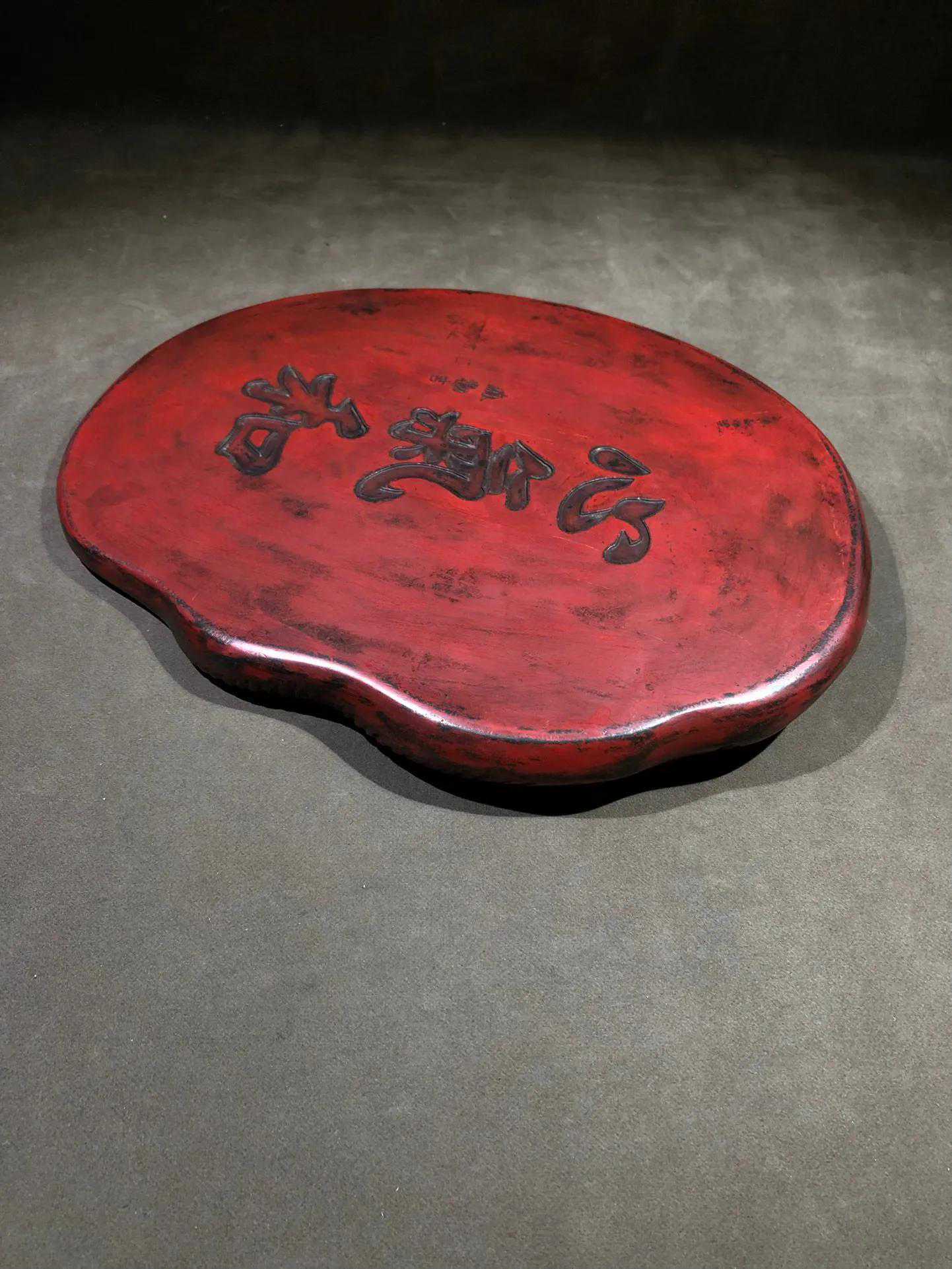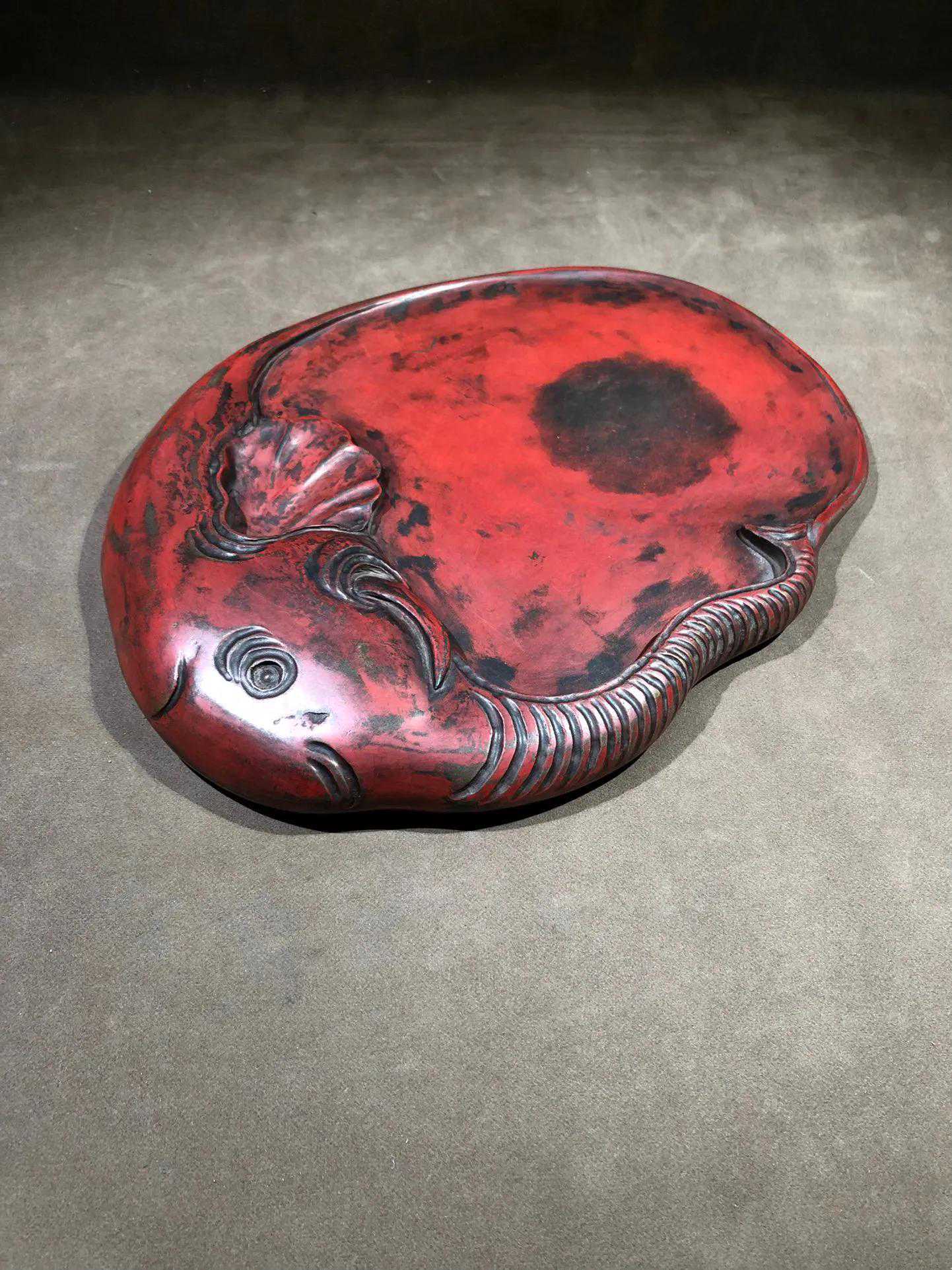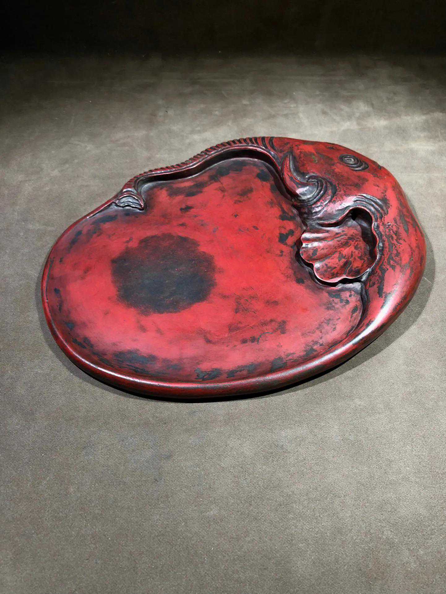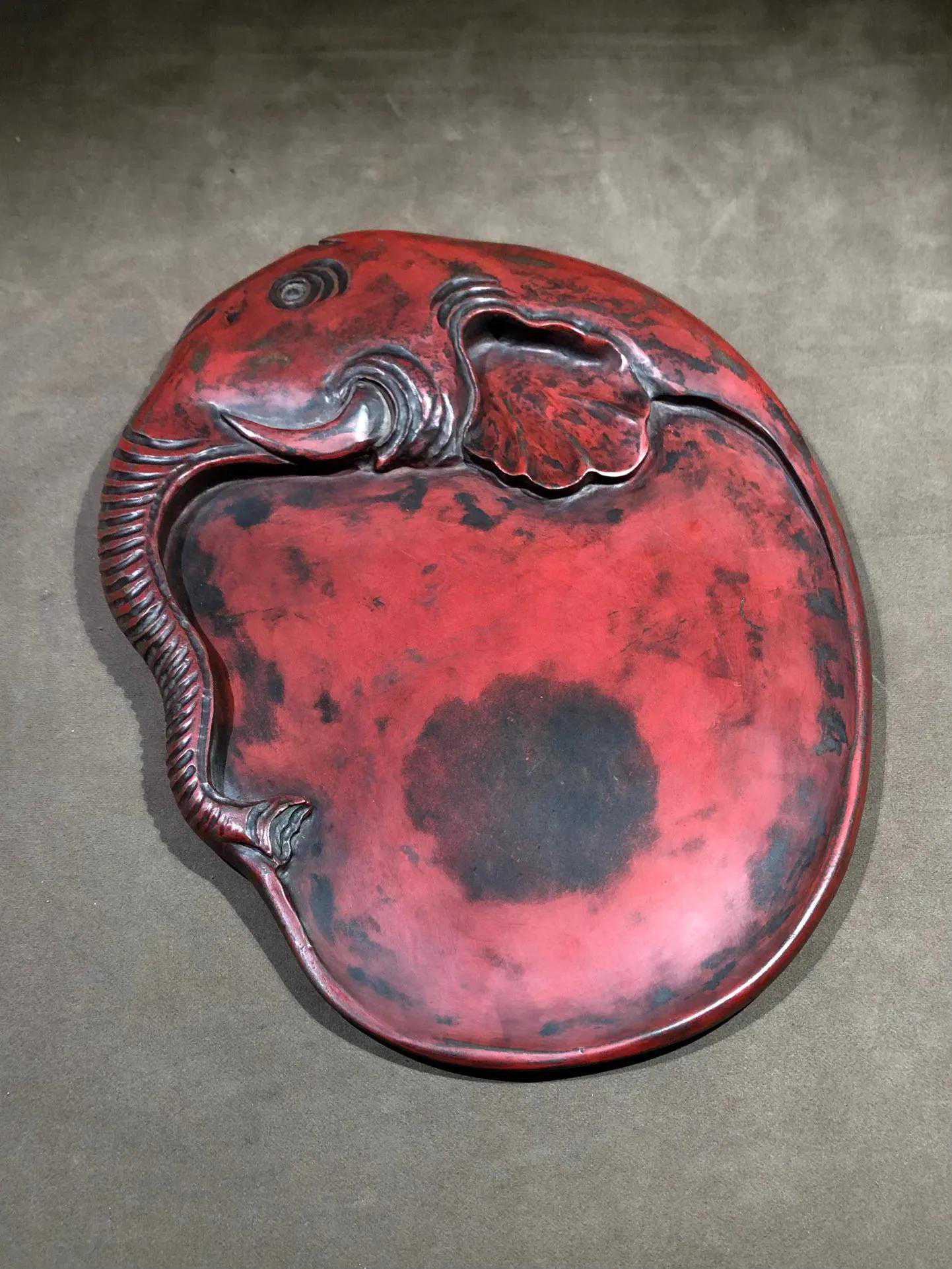 端砚,因长期研磨朱砂形成红色朱砂包浆,又称朱砚。砚形独特,线条流畅,雕刻灵动。砚背部刻大字:心气和。落款:麻勒吉。砚长30厘米,宽23厘米,厚3厘米