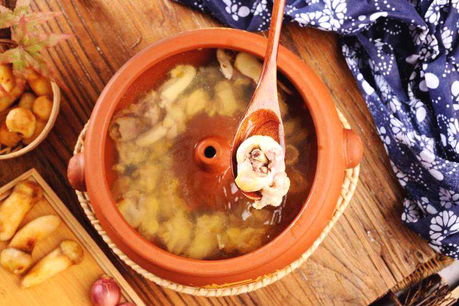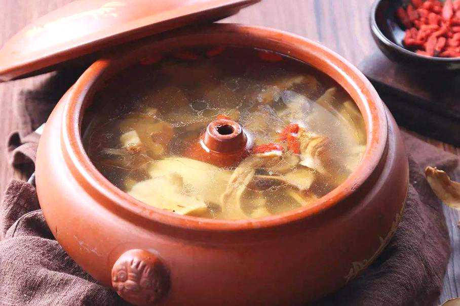 开始长期蒸馏过程,由蒸馏产生的汤水会一点点增多(无需再检查)。若烧水锅较小,中间要检查烧水锅内是否烧干并补充。根据锅的大小,2~4个小时内能够做好,以汤量和锅所对应的食用人数分量为准。若配以竹荪或类似食材,根据种类不同,在起锅前半小时左右(时机选择见注意事项最后一段)放入。若食用第二次,尽量不要动鸡肉;第一次剩的鸡油可以加入一些。