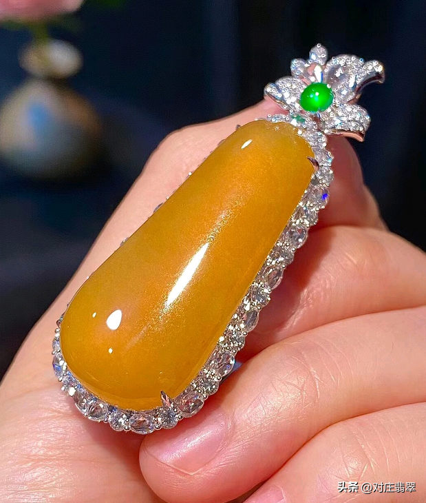 大块的黄翡较为少见,冰种以上的高端黄翡更是以挂件吊坠、戒面等形态出现。市面上常见的黄翡分类,有鸡油黄、栗子黄、柠檬黄等,但都是通过肉眼主观判断,没有明确的一个颜色界定,属于传统命名方法,带有较大误差。