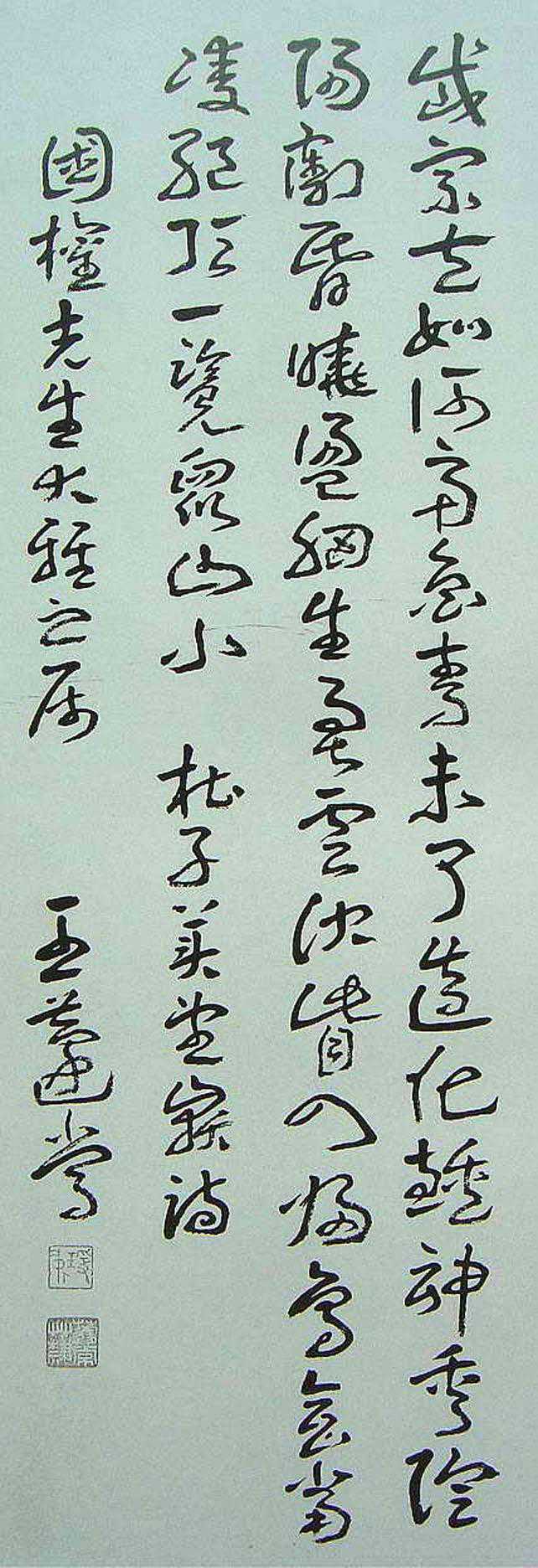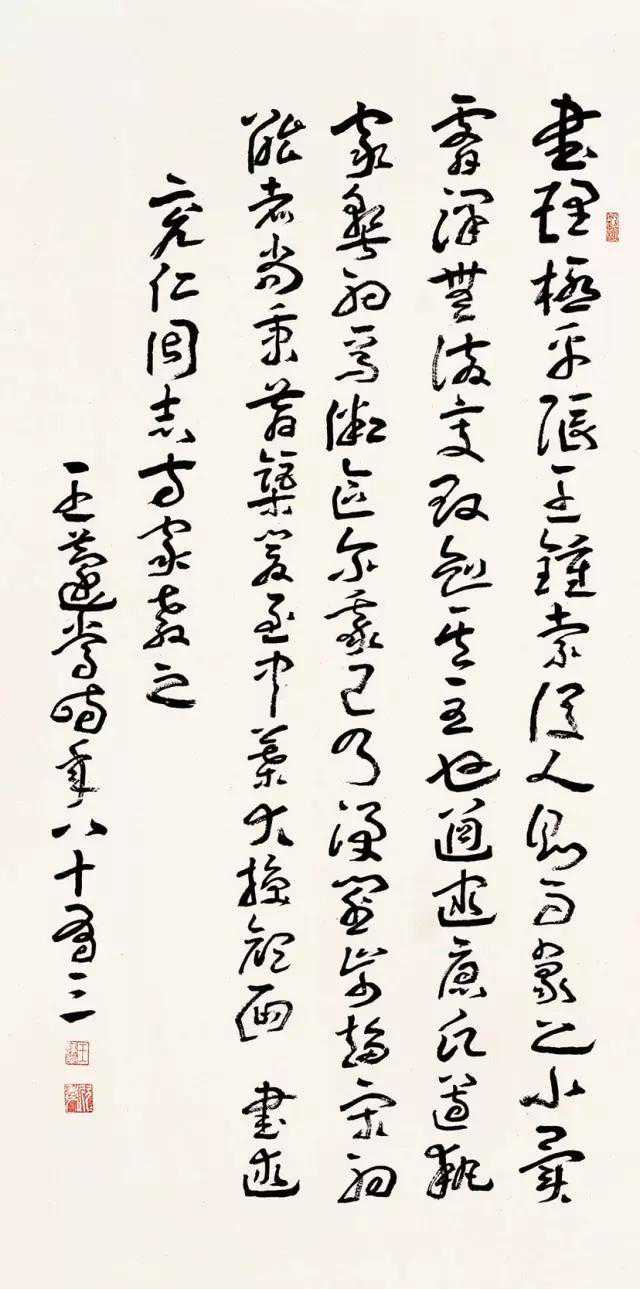 王蘧常章草简练化的用笔追求着丰富的字的结构变化,在搜罗古文奇字的造型美方面,独出心裁,建立了迥异流俗的自家章草体。透过字形与笔法的显在表现,我们赏会到一种夭娇不群的“奇古”意气,落落大方,纵横捭阖,实为创造。王的草书,独标奇绝与浑朴古迈,实在是数百年来独张一军。因此,书坛常以“蘧草”称呼王蘧常的章草书法。