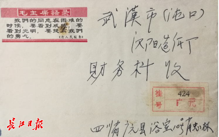 这枚信封于1970年3月31日由四川广元寄至武汉汉阳造纸厂,粘贴挂号签条,邮票面值合计28分,显然是一枚超重挂号封。对于解放军细齿邮票来说,不管是这枚信封的寄出地点,还是邮资,都是首次发现,极为难得。能在堆积如山的废纸堆中找到这枚实寄封,除了必要的集邮知识外,运气非常重要。这种幸运,让集邮充满了意想不到的乐趣。