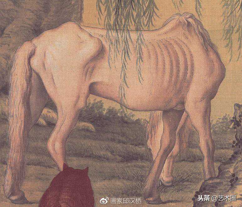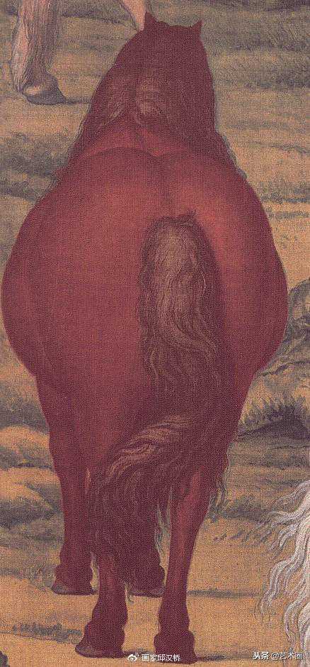 此外,树的造型、空间的处理、色彩的淡雅也蕴含着中国传统绘画的神韵。虽然是采用中国传统的颜料来作画,但在马匹、人物和柳树的表现上却融入了西画注重光影的手法,骏马立或卧之处仍有淡淡的阴影,显得立体感十足,而据说郎世宁画人像时是不画阴影的,因为时人以为像上的阴影“好似脸上的斑点瑕疵”。