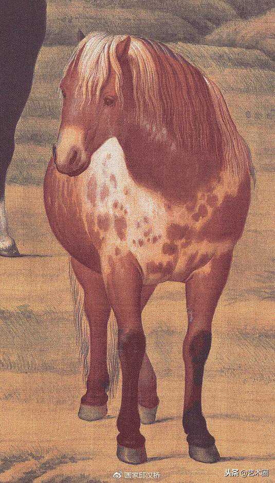 在中国美术史中马更是一个常见的题材,且不同的时代其象征意义也有所不同,如汉代霍去病墓葬的石雕群中“马踏匈奴”雕塑,以马来象征英勇善战、英年早逝的霍去病将军;唐代画马似有一种身份地位的象征;元代画马名家任仁发笔下的《二马图》则用肥瘦二马象征贪与廉;到了清代,宫廷里来自意大利的郎世宁创作了许多兼有中西特色的马的作品,以“八骏”为题材的就有许多幅。