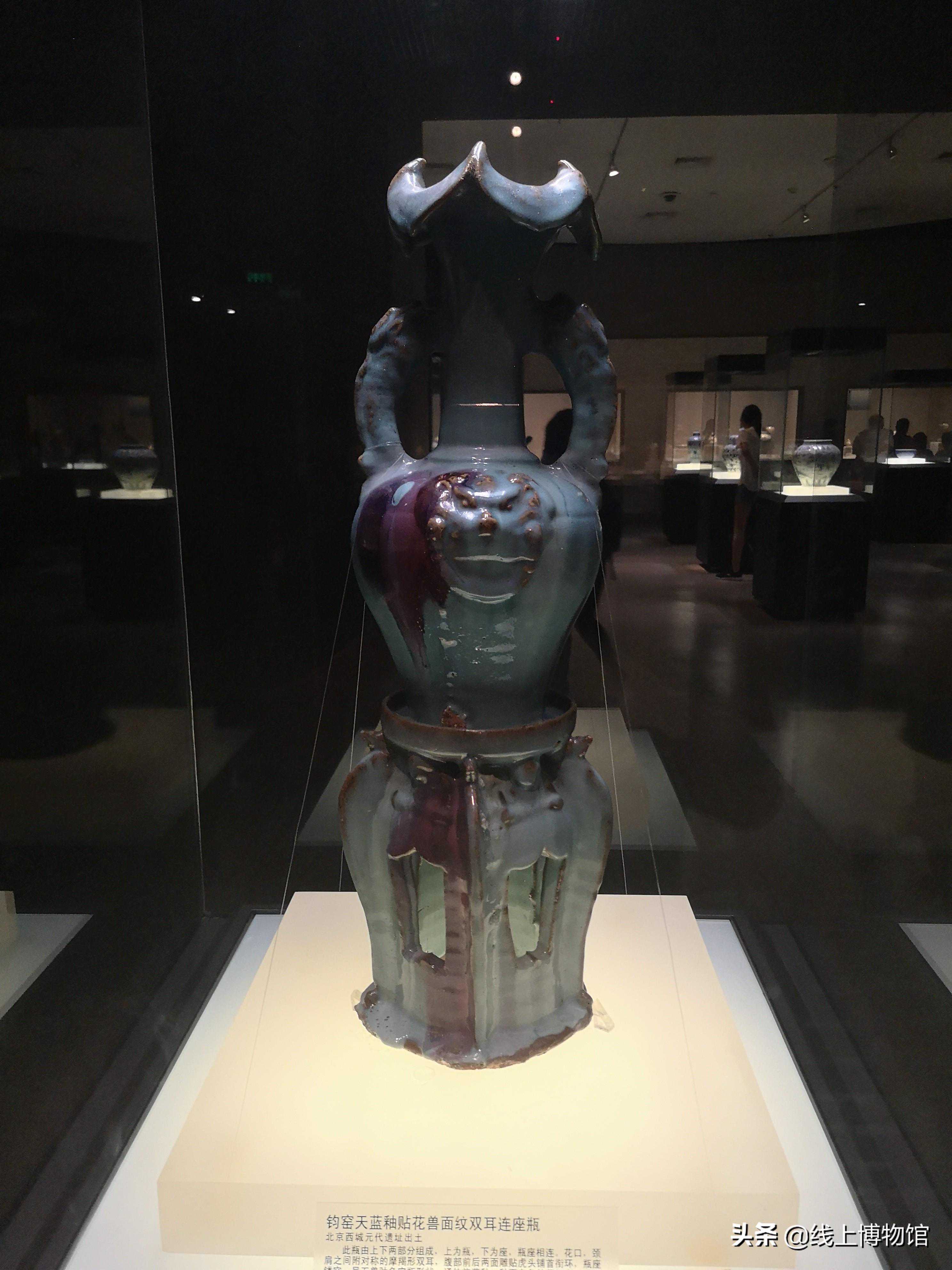 钧窑天蓝釉贴花兽面纹双耳连座瓶