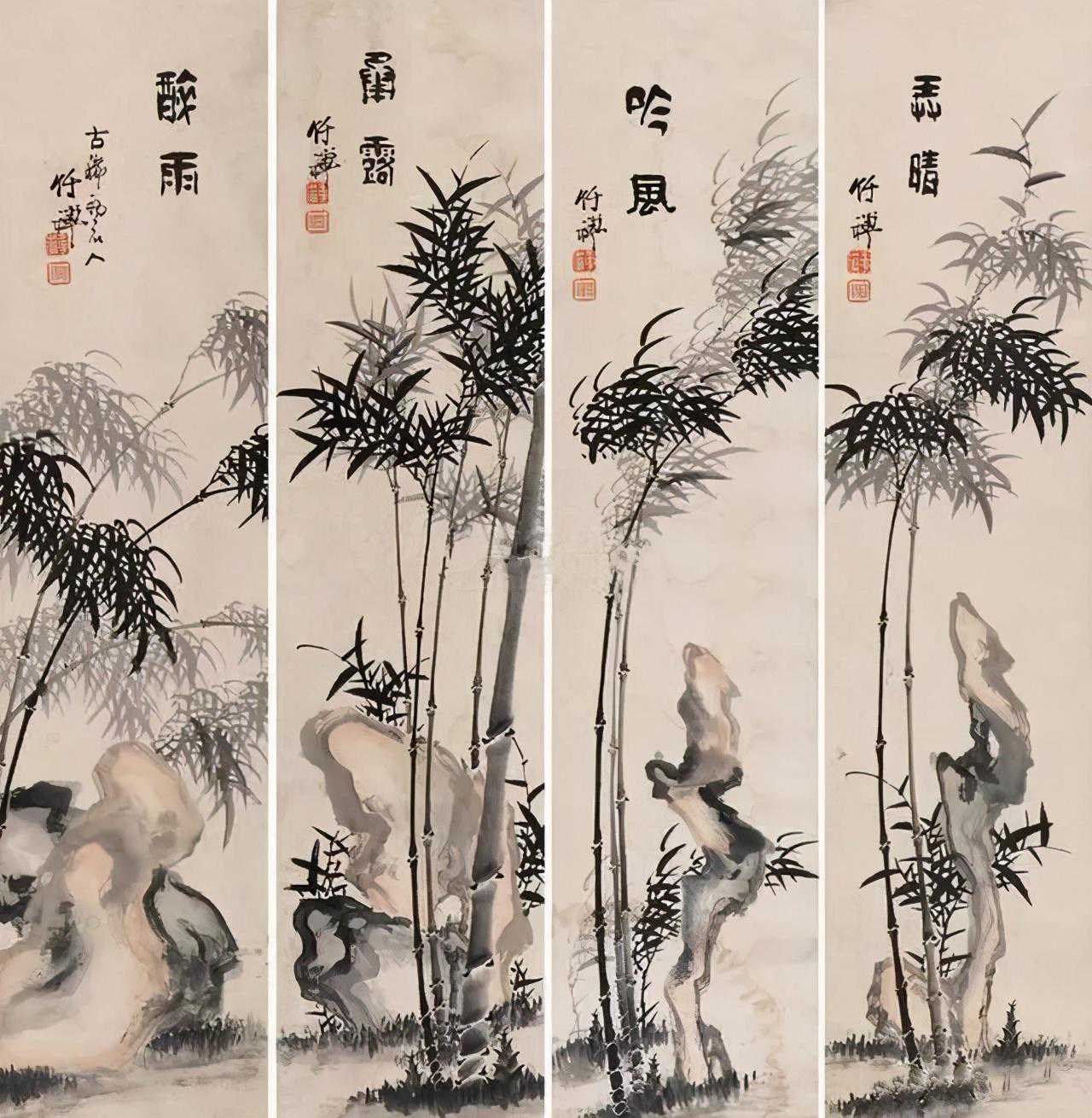 竹禅画竹,效法清初画家郑板桥。通景竹屏一堂共四幅,以拟人手法,题为吟风、烘晴、醉雨、承露,用浓淡不同的墨色再现了竹子在风、晴、雨、露中的各种神态。