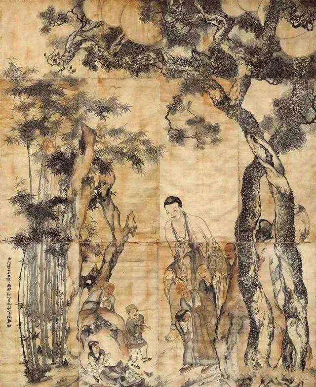 同治八年(1869年),竹禅离开重庆。经过新都宝光寺时做短暂逗留,期间他专门丈量了“说法堂”两侧的墙体长宽高,后到达上海创作了巨幅《捧沙献佛图》,委托龙藏寺星寿法师带回宝光寺悬挂。捧沙献佛又名小儿施土,画的是佛教《贤愚因缘经》里的一个故事:释迦牟尼佛与弟子阿难入城乞食,遇一群小孩在路旁游戏,他们将泥土做成房屋与仓库。其中一小孩见佛来到,顿生布施之心,即捧仓中名为"米"的沙土献佛以表虔诚。一百多年后,这个小孩转世当了国王,就是统一印度的阿育王,其他小孩也作了国王的大臣。这幅巨画,松干挺拔,竹节秀劲,佛祖面目慈祥,儿童行为天真,实是一幅形神兼备之佳作。