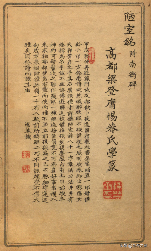 甲戌秋仲再游苏门,故友招饮卜夜,遂留宿丛桂书屋。案头置一印册,仅钤小印一方,余悉诗跋。然我醉欲眠,不暇详视也。厥明展卷,知出黎阳女氏郭梦岩之手。其石广狭仅寸许,镌陋室铭八十一字,章法刀法井井有条,称为名手,诚不虚谬。倦游归,追忆体格,欲步后尘,历旬有七日始竣。风神约可仿佛状之,聊作藏印一种。继遍捡筪笥,竟不可得,岂好事者攫入米家袖耶?抑梦岩有灵、而使两雄不并立耶?复欲为之,已不胜细字。遂逐句成方,模拟诸体,共得一十有八。较前所镌虽工巧不同,然颇觉不伤大雅矣,因钤谱而识其由。惕菴识