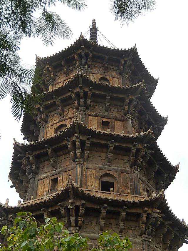接着,我们一起来到位于中轴线大雄宝殿后面的甘露戒坛参观。甘露戒坛,建在中轴线的第二台阶上。据说唐朝时候,此地常降甘露,一个叫行昭的和尚于是在这里挖了一口甘露井。北宋天禧三年(公元1019年)在井上建坛,遂称甘露戒坛。南宋建炎二年(公元1128年)敦炤和尚认为戒坛不符合规范,又按《南山图经》改建为五级,其间高低宽窄都有严格的限制。后经元、明多次重修,现存建筑是清康熙五年(公元1666年)重建的四重檐八角攒尖式结构。坛顶正中藻井采用如意斗拱,交叠上收,如蜘蛛结网,似回纹织锦,结构复杂而精巧。坛之四周立柱斗拱和铺作间24尊“飞天乐伎”,身系五彩飘带,手持琵琶、二弦、洞萧、响板,轻歌曼舞,翩翩若飞,使人马上想起敦煌的飞天艺术。它们与百柱殿的频伽一样,既是建筑艺术的瑰宝,又是研究南音与南戏十分宝贵的形象资料。戒坛门前廊柱上有副对联,有点意思,抄录如下:冷暖自知不必别求甘露;我人无相都来随喜戒坛。门廊前的巨大菩提树长得郁郁葱葱,似乎早已领略甘露的恩惠,悟到了真谛。
