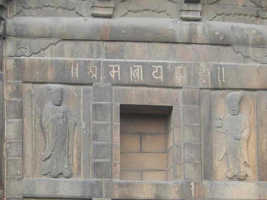去东塔的路上,经过一照壁墙,墙上有精美的浮雕,分为三部分:中间是清乾隆年间用彩色陶瓷构成的麒麟踏花图,麒麟神态逼真,蹄下落英缤纷。左右两边是梅花、仙鹤、鹿、大象、兰草等吉祥物构成的图案。