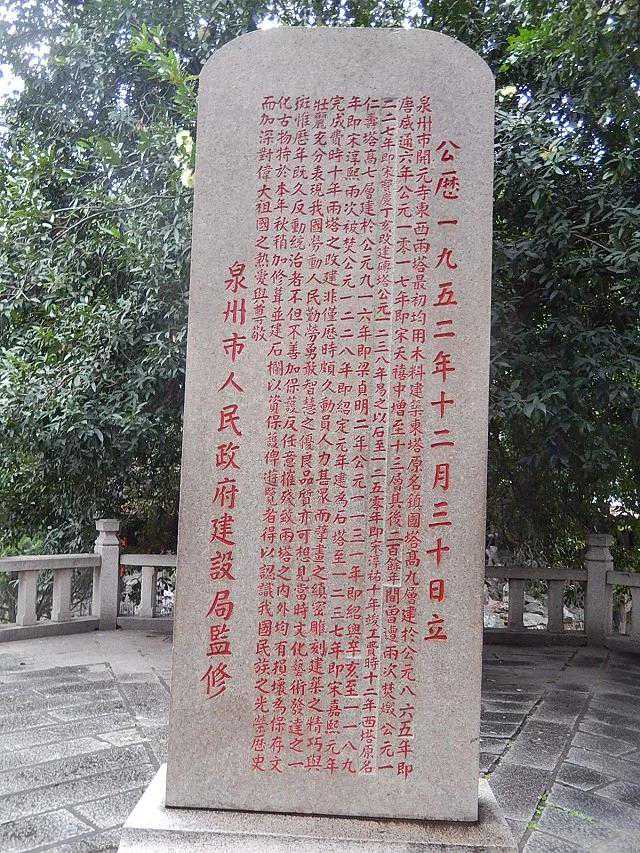 开元寺双塔是中国最高的一对石塔,双塔塔身浮雕精美,经明万历年间泉州八级地震以及很多次台风的考验,仍屹立不倒。我注意到,在东塔附近的高台中央,有一块1952年12月30日泉州市建设局树立的石碑,碑文介绍了双塔修建的历史和人民政府的重视。站在高台上,这里是拍摄东塔的最佳位置。