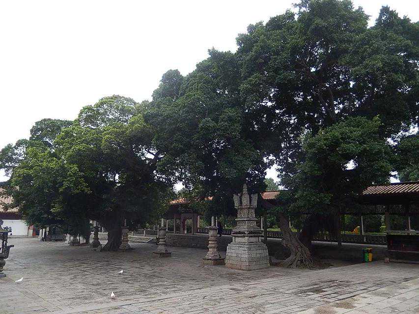 跨过山门就到了拜亭,然后进入拜庭院中。拜庭两边分列着八棵大榕树,树龄在200至800岁,两旁古榕参天。站在这里,我们可以看到拔地而起的东西塔和宽敞明亮的东西两廊对称地排列在两旁,而我们所在的位置就在开元寺的中轴线上。佛教传入我国巳有一千多年历史,并在中国落地开花,与中国文化融为一体。开元寺的布局就突出了我国古建筑的南面为尊和中轴线为主的特点。中轴线自南而北依次有:紫云屏、山门(天王殿)、拜亭、大雄宝殿、甘露戒坛、藏经阁。东翼有檀越祠、泉州佛教博物馆(弘一法师纪念馆)、准提禅院、东壁寺(古船馆);西翼有尊圣院、功德堂、水陆禅寺等。
