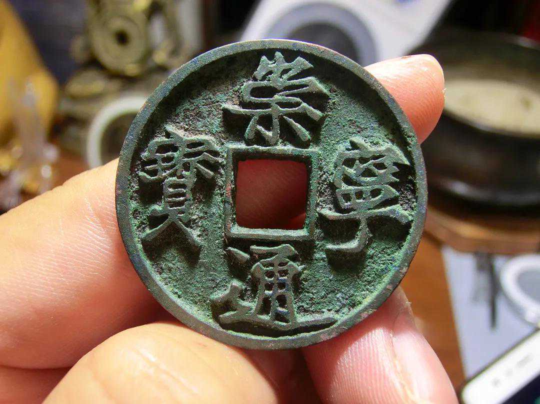 崇宁通宝此钱宁字心偏向外点通长且无回扣笔,类似铁母钱宁。在通上方头部呈三角形,又称三角通等。还有崇字中下部示字小中间竖勾细且向右斜。