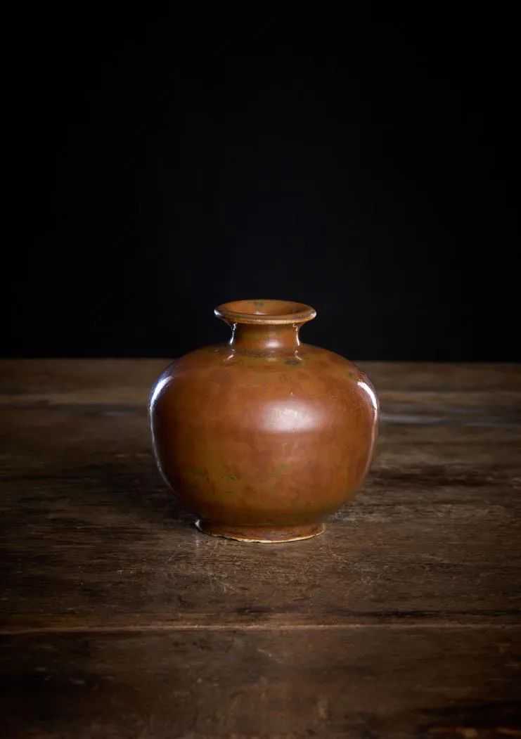 定窑少有的精品酱釉,即“紫定”,色泽滋润柔和,呈色稳定,莹洁可鉴,在烧窑中有些许窑变出现,在酱釉之上有近乎铁色的窑变色斑出现,让单色釉中仍有色彩的跳跃变化,在视觉中有过渡和灵动之享,釉色营造的内敛和高级感,让整器更具宋瓷的典雅含蓄,传承了宋代文化的精髓——质朴且典雅。