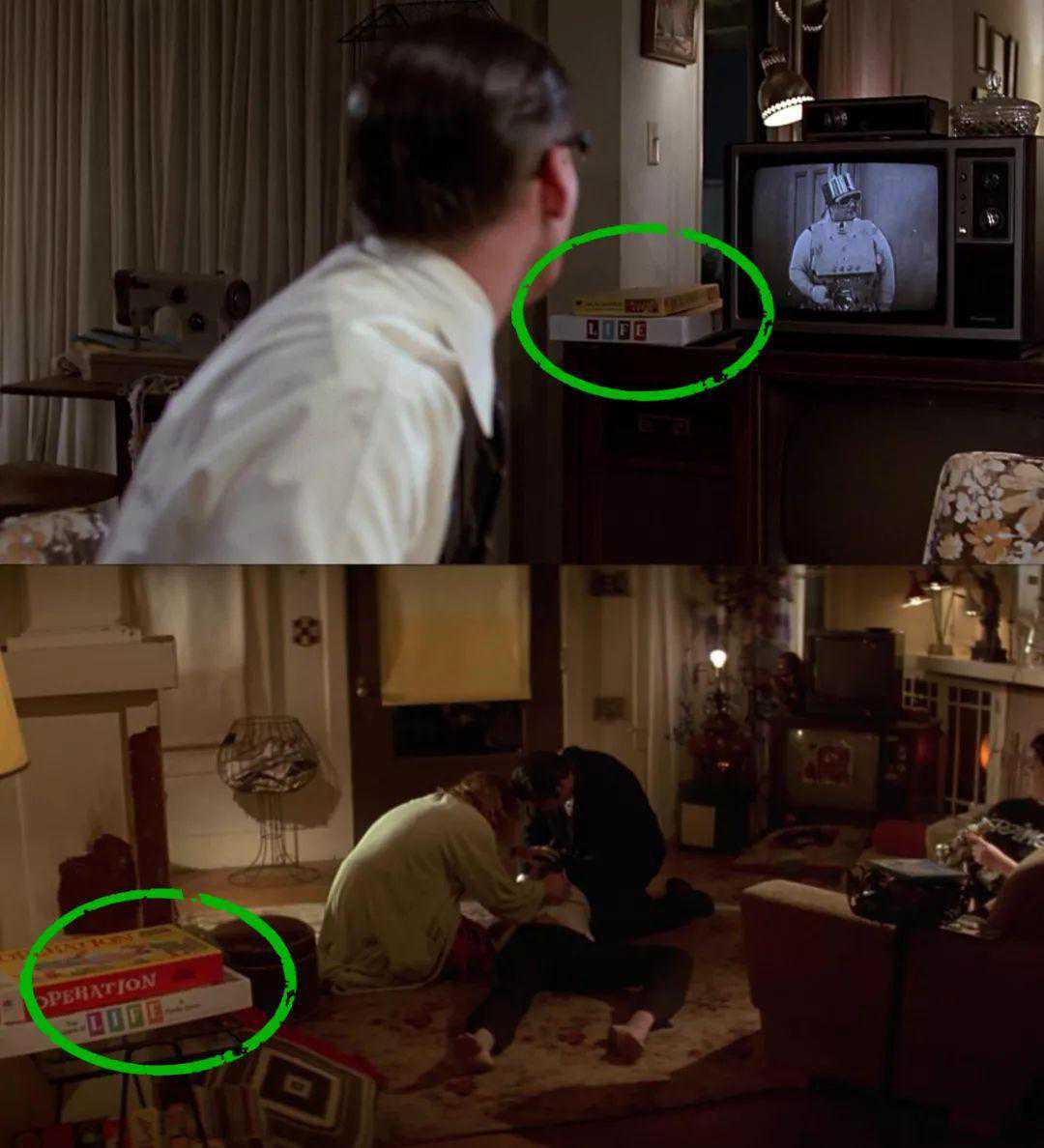 昆汀在这个场景中,往桌上放了两盘游戏,《Operation》和《TheGameofLife》。正是在[回到未来]里出现过的两个游戏。